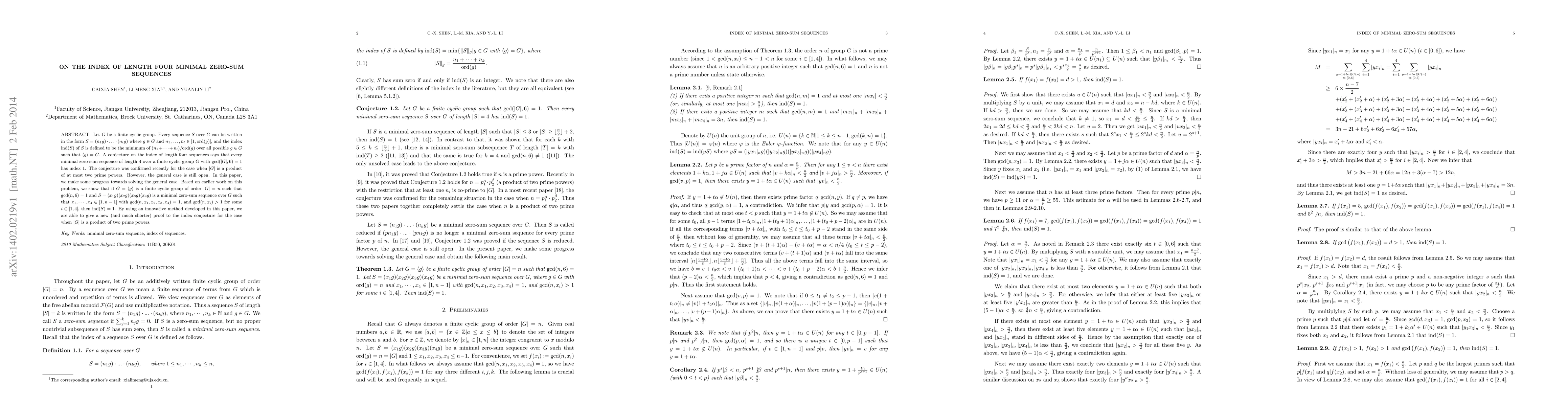 Let $G$ be a finite cyclic group. Every sequence $S$ over $G$ can be written in the form $S=(n_1g)\cdot\ldots\cdot(n_lg)$ where $g\in G$ and $n_1, \ldots, n_l\in[1, \ord(g)]$, and the index $\ind(S)$ of $S$ is defined to be the minimum of $(n_1+\cdots+n_l)/\ord(g)$ over all possible $g\in G$ such that $\langle g \rangle =G$. A conjecture on the index of length four sequences says that every minimal zero-sum sequence of length 4 over a finite cyclic group $G$ with $\gcd(|G|, 6)=1$ has index 1. The conjecture was confirmed recently for the case when $|G|$ is a product of at most two prime powers. However, the general case is still open. In this paper, we make some progress towards solving the general case. Based on earlier work on this problem, we show that if $G=\langle g\rangle$ is a finite cyclic group of order $|G|=n$ such that $\gcd(n,6)=1$ and $S=(x_1g)(x_2g)(x_3g)(x_4g)$ is a minimal zero-sum sequence over $G$ such that $x_1,\cdots,x_4\in[1,n-1]$ with $\gcd(n,x_1,x_2,x_3,x_4)=1$, and $\gcd(n,x_i)>1$ for some $i\in[1,4]$, then $\ind(S)=1$. By using an innovative method developed in this paper, we are able to give a new (and much shorter) proof to the index conjecture for the case when $|G|$ is a product of two prime powers.