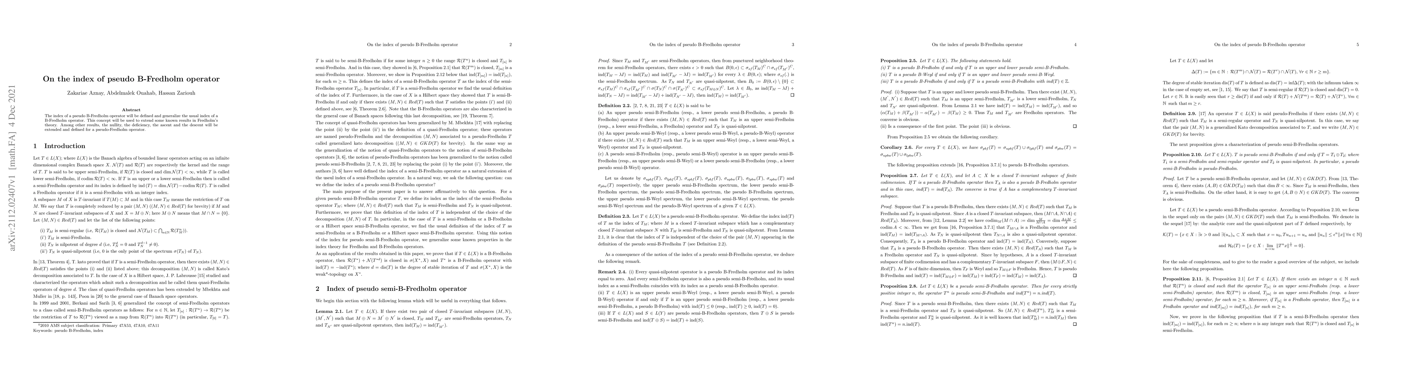 This paper introduces a new concept called the index of pseudo B-Fredholm operators, extending existing results in Fredholm theory to include pseudo-Fredholm operators. The findings provide a generalization of nullity, deficiency, ascent, and descent for pseudo-Fredholm operators.