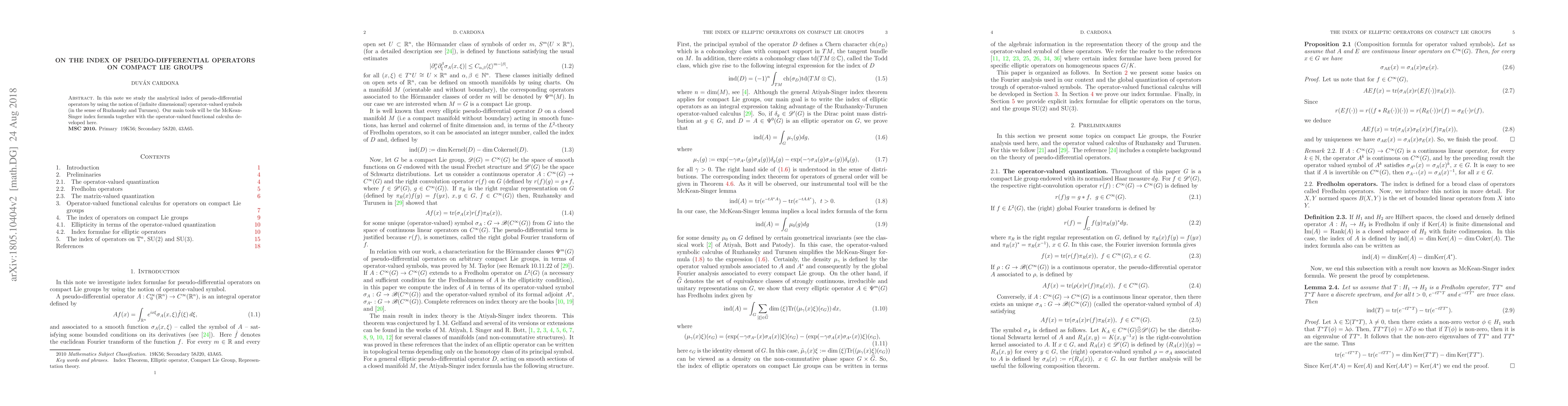 This paper investigates the analytical index of pseudo-differential operators on compact Lie groups using operator-valued symbols. The authors employ the McKean-Singer index formula and a newly developed operator-valued functional calculus to achieve their results.