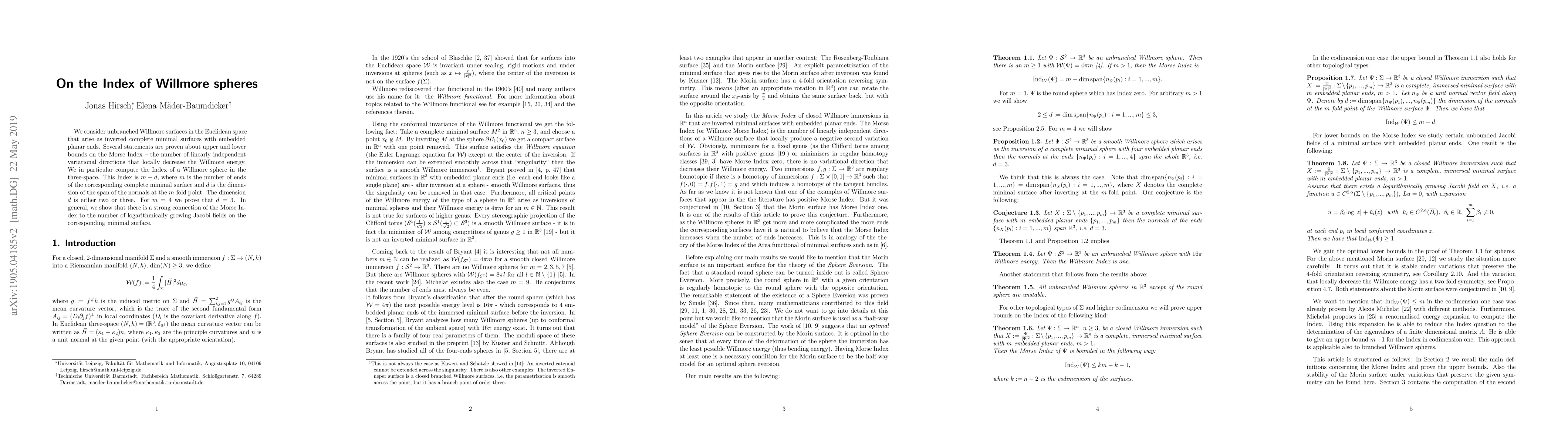 We consider unbranched Willmore surfaces in the Euclidean space that arise as inverted complete minimal surfaces with embedded planar ends. Several statements are proven about upper and lower bounds on the Morse Index - the number of linearly independent variational directions that locally decrease the Willmore energy. We in particular compute the Index of a Willmore sphere in the three-space. This Index is $m-d$, where $m$ is the number of ends of the corresponding complete minimal surface and $d$ is the dimension of the span of the normals at the $m$-fold point. The dimension $d$ is either two or three. For $m=4$ we prove that $d=3$. In general, we show that there is a strong connection of the Morse Index to the number of logarithmically growing Jacobi fields on the corresponding minimal surface.