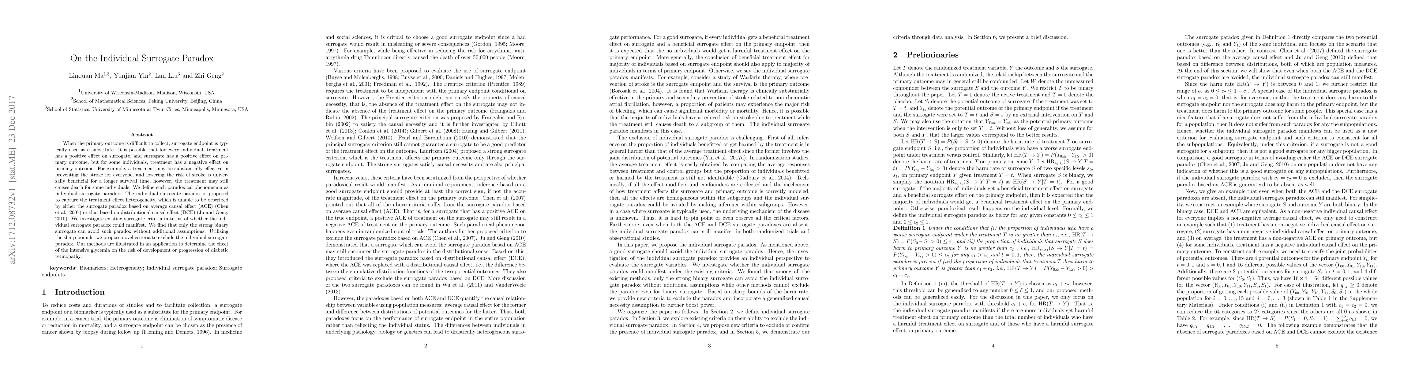 When the primary outcome is difficult to collect, surrogate endpoint is typically used as a substitute. It is possible that for every individual, treatment has a positive effect on surrogate, and surrogate has a positive effect on primary outcome, but for some individuals, treatment has a negative effect on primary outcome. For example, a treatment may be substantially effective in preventing the stroke for everyone, and lowering the risk of stroke is universally beneficial for a longer survival time, however, the treatment may still cause death for some individuals. We define such paradoxical phenomenon as individual surrogate paradox. The individual surrogate paradox is preposed to capture the treatment effect heterogeneity, which is unable to be described by either the surrogate paradox based on average causal effect (ACE) (Chen et al., 2007) or that based on distributional causal effect (DCE) (Ju and Geng, 2010). We investigate existing surrogate criteria in terms of whether the individual surrogate paradox could manifest. We find that only the strong binary surrogate can avoid such paradox without additional assumptions. Utilizing the sharp bounds, we propose novel criteria to exclude the individual surrogate paradox. Our methods are illustrated in an application to determine the effect of the intensive glycemia on the risk of development or progression of diabetic retinopathy.