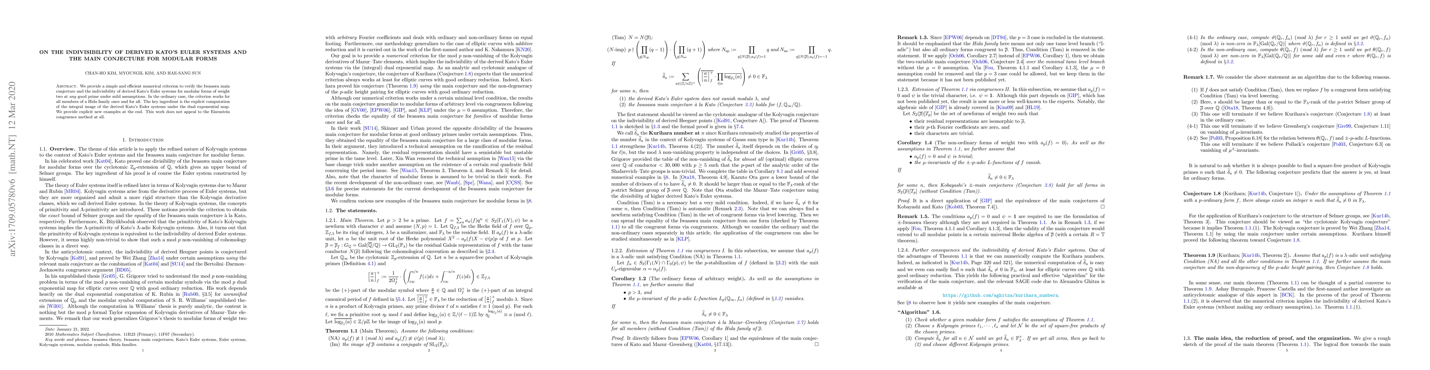 We provide a simple and efficient numerical criterion to verify the Iwasawa main conjecture and the indivisibility of derived Kato's Euler systems for modular forms of weight two at any good prime under mild assumptions. In the ordinary case, the criterion works for all members of a Hida family once and for all. The key ingredient is the explicit computation of the integral image of the derived Kato's Euler systems under the dual exponential map. We provide explicit new examples at the end. This work does not appeal to the Eisenstein congruence method at all.