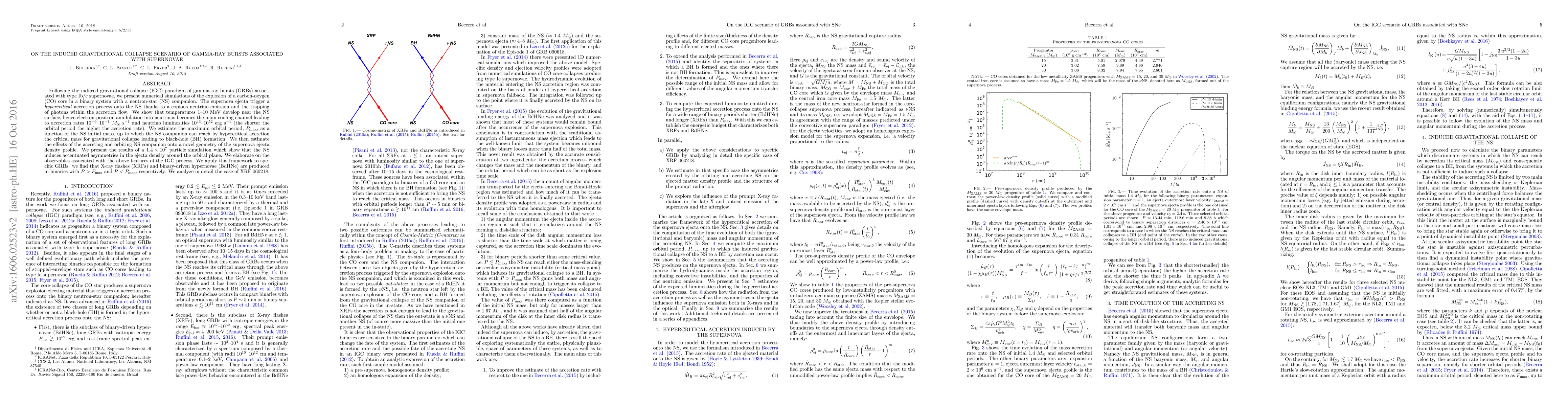 This paper explores the induced gravitational collapse (IGC) model for gamma-ray bursts (GRBs) linked to supernovae, simulating the hypercritical accretion process onto a neutron star in a binary system. It predicts high accretion rates and neutrino luminosities, and estimates the maximum orbital period for black-hole formation, revealing asymmetries in supernova ejecta density profiles and linking these features to specific GRB phenomena like X-ray flashes and binary-driven hypernovae.