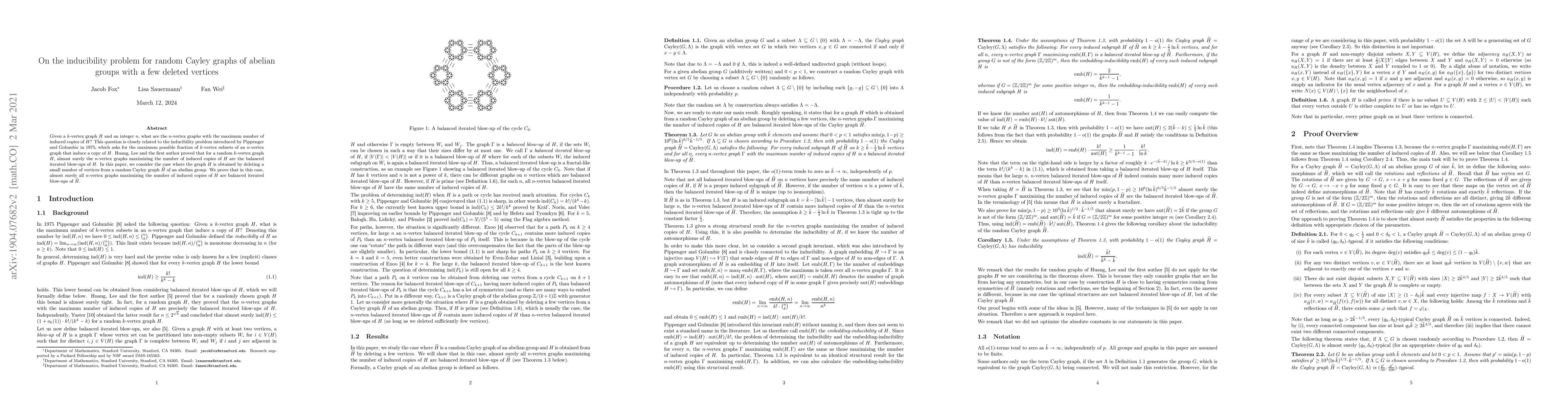 Given a $k$-vertex graph $H$ and an integer $n$, what are the $n$-vertex graphs with the maximum number of induced copies of $H$? This question is closely related to the inducibility problem introduced by Pippenger and Golumbic in 1975, which asks for the maximum possible fraction of $k$-vertex subsets of an $n$-vertex graph that induce a copy of $H$. Huang, Lee and the first author proved that for a random $k$-vertex graph $H$, almost surely the $n$-vertex graphs maximizing the number of induced copies of $H$ are the balanced iterated blow-ups of $H$. In this paper, we consider the case where the graph $H$ is obtained by deleting a small number of vertices from a random Cayley graph $\widetilde{H}$ of an abelian group. We prove that in this case, almost surely all $n$-vertex graphs maximizing the number of induced copies of $H$ are balanced iterated blow-ups of $\widetilde{H}$.