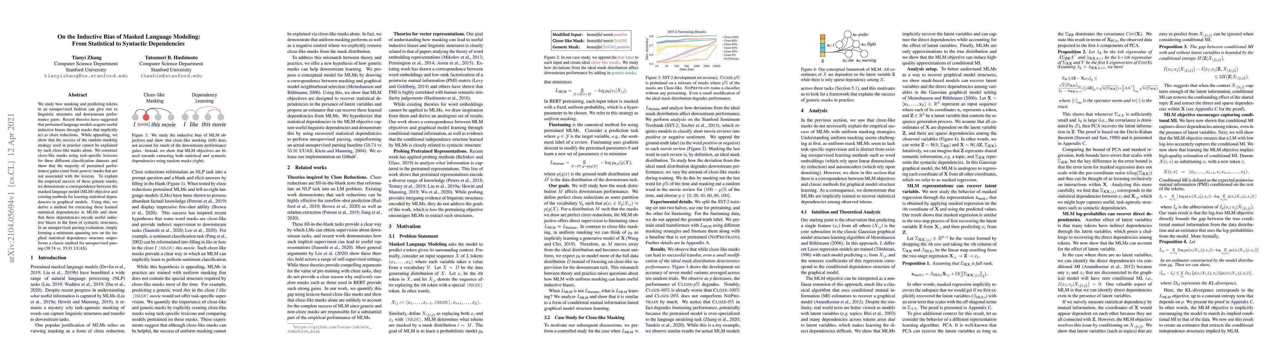 The paper investigates the inductive biases acquired by masked language models (MLMs) through random token masking, comparing it with cloze-like masks derived from task-specific lexicons. It establishes a link between MLM objectives and statistical dependency learning in graphical models.