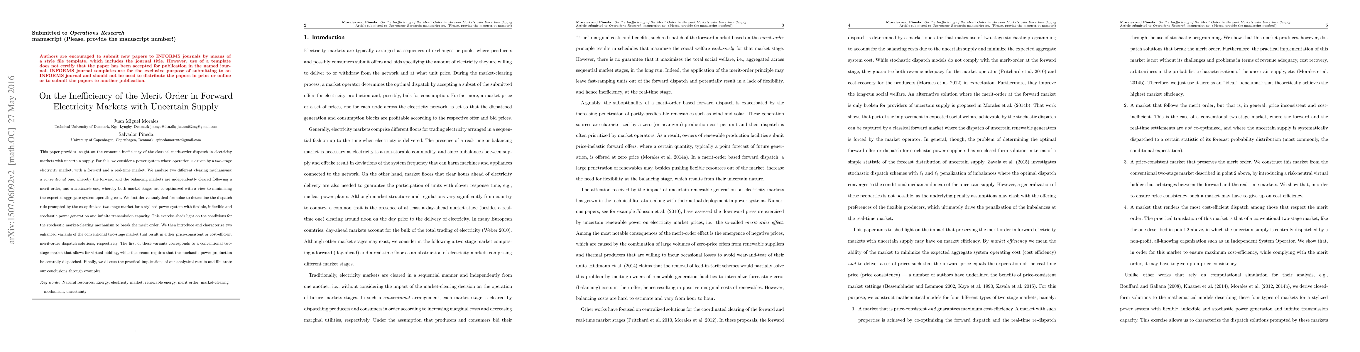 This paper provides insight on the economic inefficiency of the classical merit-order dispatch in electricity markets with uncertain supply. For this, we consider a power system whose operation is driven by a two-stage electricity market, with a forward and a real-time market. We analyze two different clearing mechanisms: a conventional one, whereby the forward and the balancing markets are independently cleared following a merit order, and a stochastic one, whereby both market stages are co-optimized with a view to minimizing the expected aggregate system operating cost. We first derive analytical formulae to determine the dispatch rule prompted by the co-optimized two-stage market for a stylized power system with flexible, inflexible and stochastic power generation and infinite transmission capacity. This exercise sheds light on the conditions for the stochastic market-clearing mechanism to break the merit order. We then introduce and characterize two enhanced variants of the conventional two-stage market that result in either price-consistent or cost-efficient merit-order dispatch solutions, respectively. The first of these variants corresponds to a conventional two-stage market that allows for virtual bidding, while the second requires that the stochastic power production be centrally dispatched. Finally, we discuss the practical implications of our analytical results and illustrate our conclusions through examples.