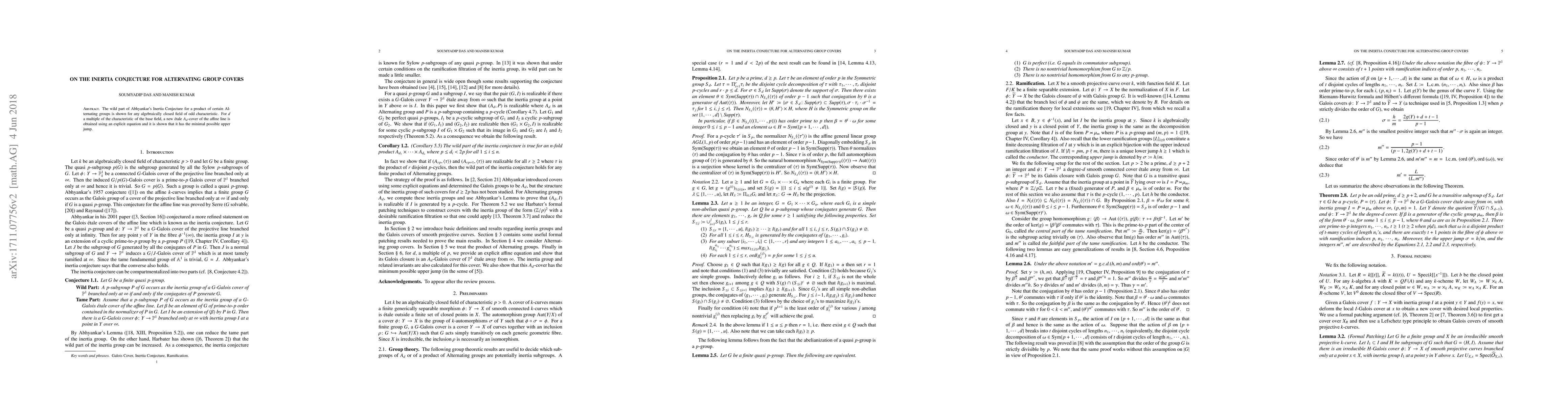 The paper proves Abhyankar's Inertia Conjecture for products of certain Alternating groups over algebraically closed fields of odd characteristic. It introduces a new étale $A_d$-cover of the affine line with $d$ being a multiple of the characteristic, demonstrating it has the minimal possible upper jump.