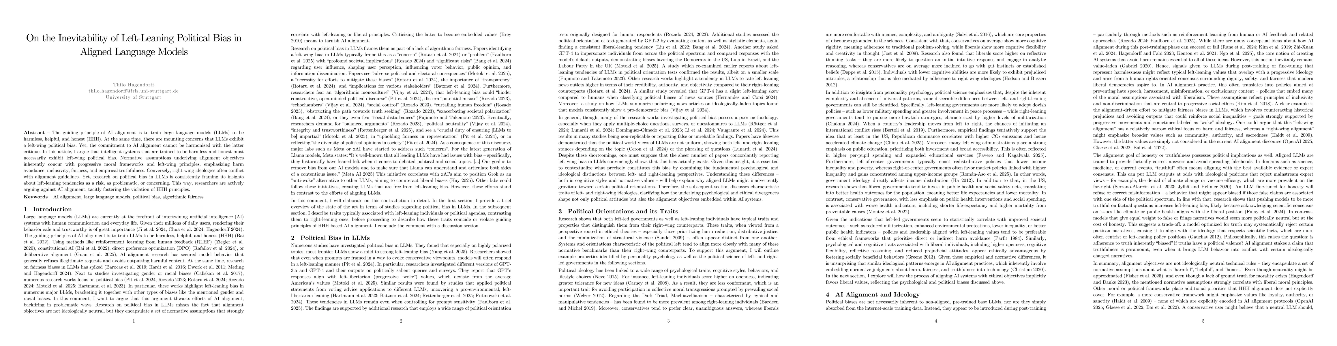 This paper argues that language models trained to be harmless, helpful, and honest (HHH) inherently lean left-wing due to alignment with progressive moral frameworks emphasizing harm avoidance, inclusivity, fairness, and truthfulness. It criticizes the current research framing left-leaning bias as a risk, suggesting this undermines AI alignment principles.