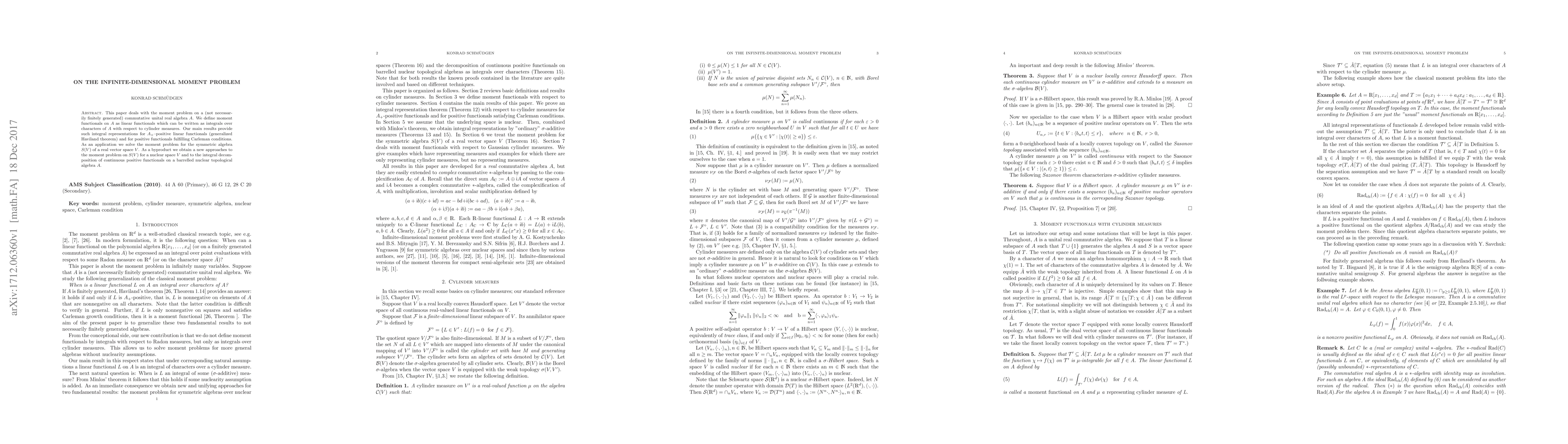 This paper deals with the moment problem on a (not necessarily finitely generated) commutative unital real algebra $A$. We define moment functionals on $A$ as linear functionals which can be written as integrals over characters of $A$ with respect to cylinder measures. Our main results provide such integral representations for $A_+$--positive linear functionals (generalized Haviland theorem) and for positive functionals fulfilling Carleman conditions. As an application we solve the moment problem for the symmetric algebra $S(V)$ of a real vector space $V$. As a byproduct we obtain a new approaches to the moment problem on $S(V)$ for a nuclear space $V$ and to the integral decomposition of continuous positive functionals on a barrelled nuclear topological algebra $A$.