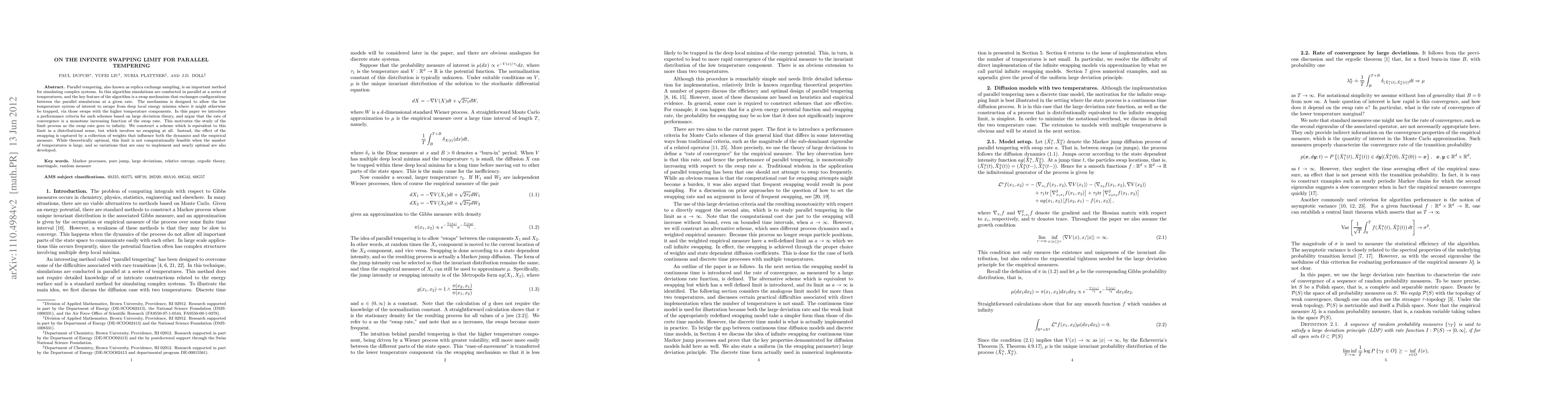 This paper introduces a performance criterion for parallel tempering based on large deviation theory, showing that convergence rate improves with higher swap rates. It proposes an infinite swap rate limit equivalent in distribution but without actual swaps, using weights instead, and develops feasible variations for practical use.