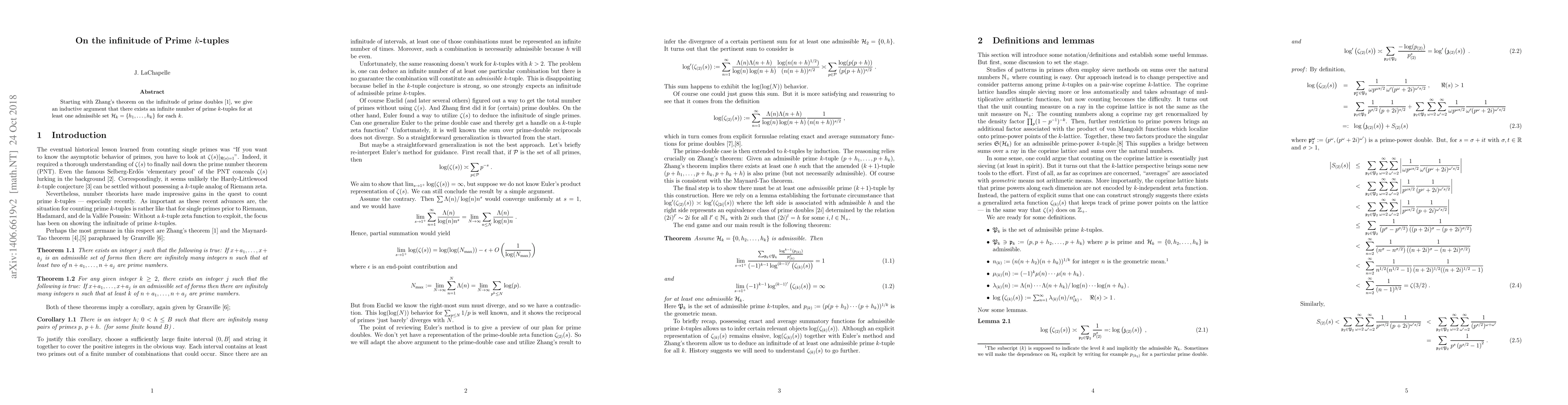 Summary: Zhang's theorem on the infinitude of prime pairs extends through an inductive argument to demonstrate the existence of infinitely many prime $k$-tuples for at least one admissible set $\mathcal{H}_k$. This result generalizes the prime number theorem to higher tuples.
