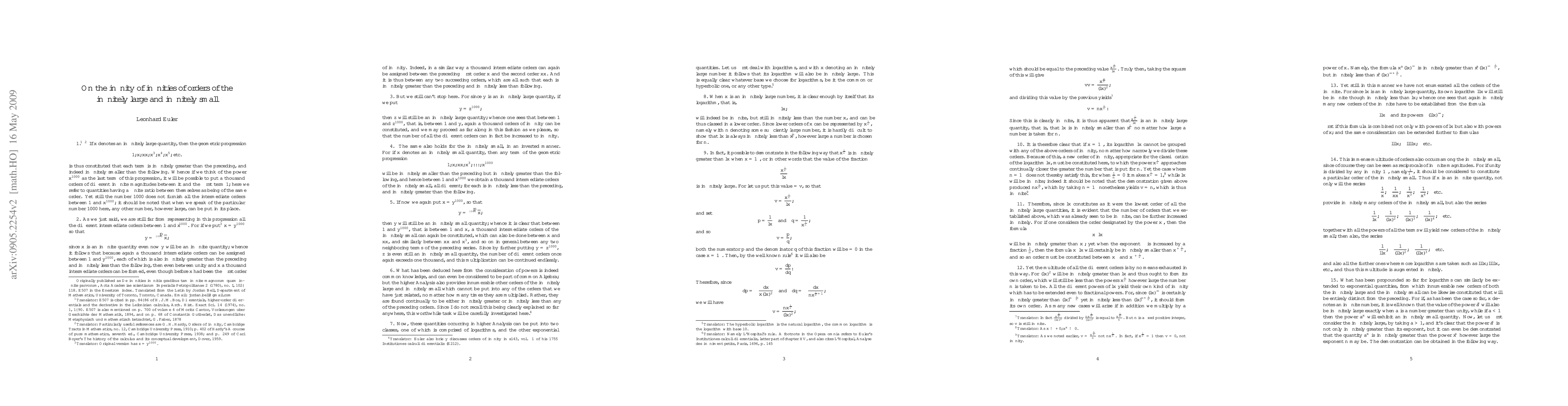 Translation (by J.B.) from the original Latin of Euler's "De infinities infinitis gradibus tam infinite magnorum quam infinite parvorum" (1780). E507 in the Enestr\"om index. Euler discusses orders of infinity in this paper. In other words this paper is about how different functions approach infinity or 0 at different rates. I was not certain about what Euler means by "infinities infiniti". Probably he means that $x,x^2,x^3$, etc. are infinitely many orders of infinity, and $\log x,(\log x)^2, (\log x)^3$, etc. are infinitely many orders of infinity, so the combinations of them are an infinity of infinities of orders of infinity. In fact Euler mentions other orders of infinity in this paper. It would be worthwhile to study this paper more to figure out exactly what Euler means here. Another translation of the title is "On the infinitely infinite orders of the infinitely large and infinitely small". Here's another place Euler uses the phrase "infinities infiniti". The phrase "infinities infiniti" from the title is used by Euler also in section 21 of E302, "De motu vibratio tympanorum". Truesdell translates this phrase on p. 333 of "The rational mechanics of flexible or elastic bodies" as "infinity of infinities". I'd like to thank Martin Mattmueller for clearing up some questions.