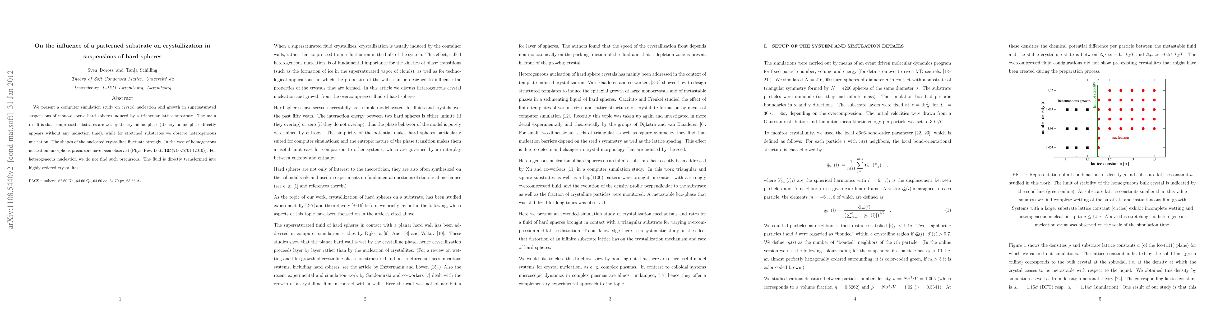 This study uses computer simulations to investigate crystal nucleation and growth in supersaturated hard sphere suspensions influenced by a patterned triangular lattice substrate. Compressed substrates lead to direct crystallization without induction time, while stretched substrates result in heterogeneous nucleation with fluctuating crystallite shapes and no amorphous precursors.