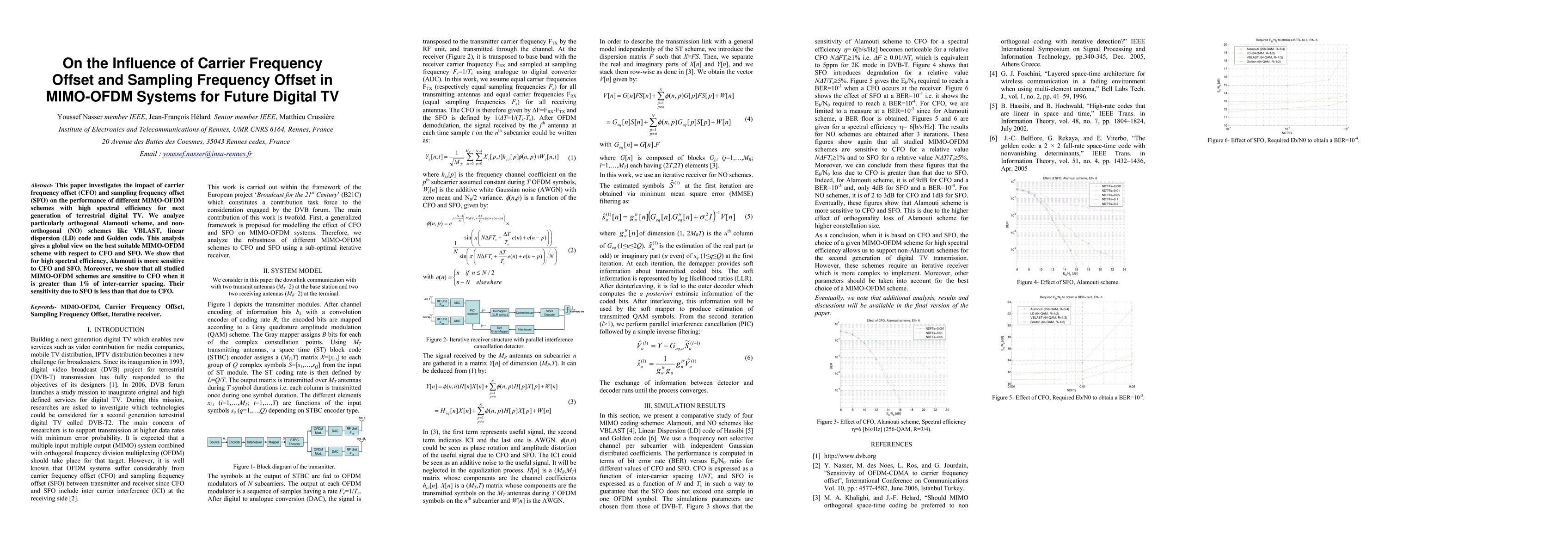 This paper examines the effects of carrier frequency offset (CFO) and sampling frequency offset (SFO) on various MIMO-OFDM schemes for future digital TV, finding that while all schemes are sensitive to CFO, especially when it exceeds 1% of inter-carrier spacing, the orthogonal Alamouti scheme is more affected than non-orthogonal schemes like VBLAST, LD code, and Golden code.