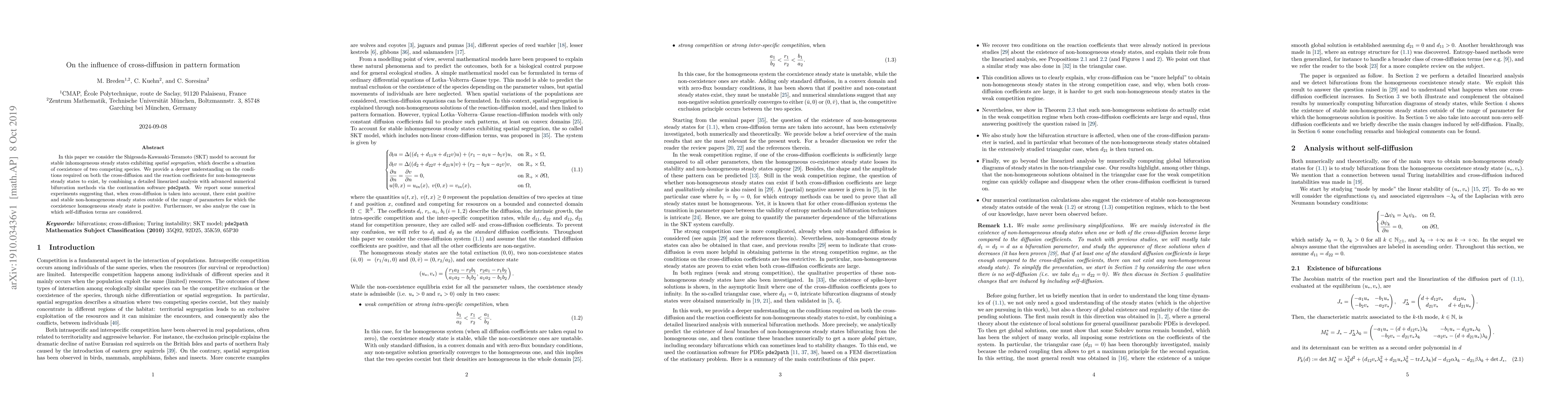 In this paper we consider the Shigesada-Kawasaki-Teramoto (SKT) model to account for stable inhomogeneous steady states exhibiting spatial segregation, which describe a situation of coexistence of two competing species. We provide a deeper understanding on the conditions required on both the cross-diffusion and the reaction coefficients for non-homogeneous steady states to exist, by combining a detailed linearized analysis with advanced numerical bifurcation methods via the continuation software pde2path. We report some numerical experiments suggesting that, when cross-diffusion is taken into account, there exist positive and stable non-homogeneous steady states outside of the range of parameters for which the coexistence homogeneous steady state is positive. Furthermore, we also analyze the case in which self-diffusion terms are considered.