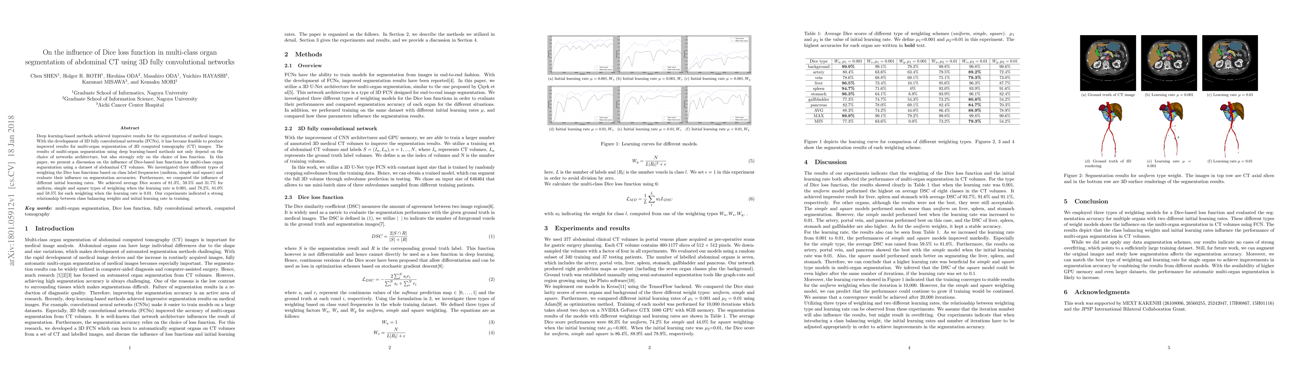This study explores the impact of different Dice loss weighting methods on multi-class organ segmentation in abdominal CT scans using 3D fully convolutional networks. Results showed varied segmentation accuracies based on the choice of Dice loss weighting (uniform, simple, square) and initial learning rates, highlighting the significance of balancing classes and learning rates in training.