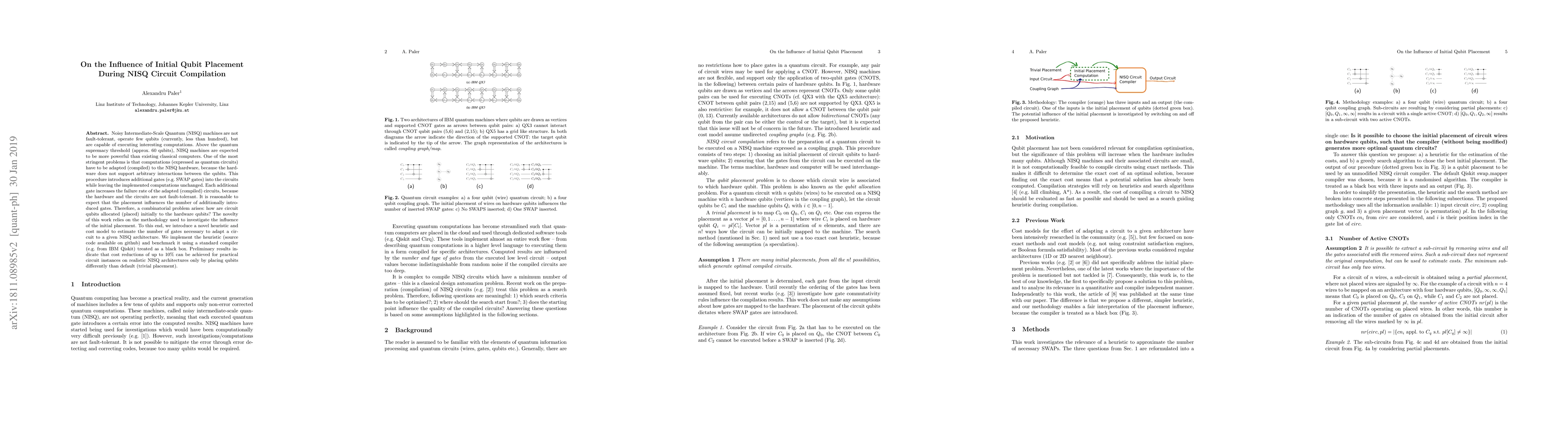Noisy Intermediate-Scale Quantum (NISQ) machines are not fault-tolerant, operate few qubits (currently, less than hundred), but are capable of executing interesting computations. Above the quantum supremacy threshold (approx. 60 qubits), NISQ machines are expected to be more powerful than existing classical computers. One of the most stringent problems is that computations (expressed as quantum circuits) have to be adapted (compiled) to the NISQ hardware, because the hardware does not support arbitrary interactions between the qubits. This procedure introduces additional gates (e.g. SWAP gates) into the circuits while leaving the implemented computations unchanged. Each additional gate increases the failure rate of the adapted (compiled) circuits, because the hardware and the circuits are not fault-tolerant. It is reasonable to expect that the placement influences the number of additionally introduced gates. Therefore, a combinatorial problem arises: how are circuit qubits allocated (placed) initially to the hardware qubits? The novelty of this work relies on the methodology used to investigate the influence of the initial placement. To this end, we introduce a novel heuristic and cost model to estimate the number of gates necessary to adapt a circuit to a given NISQ architecture. We implement the heuristic (source code available on github) and benchmark it using a standard compiler (e.g. from IBM Qiskit) treated as a black box. Preliminary results indicate that cost reductions of up to 10\% can be achieved for practical circuit instances on realistic NISQ architectures only by placing qubits differently than default (trivial placement).