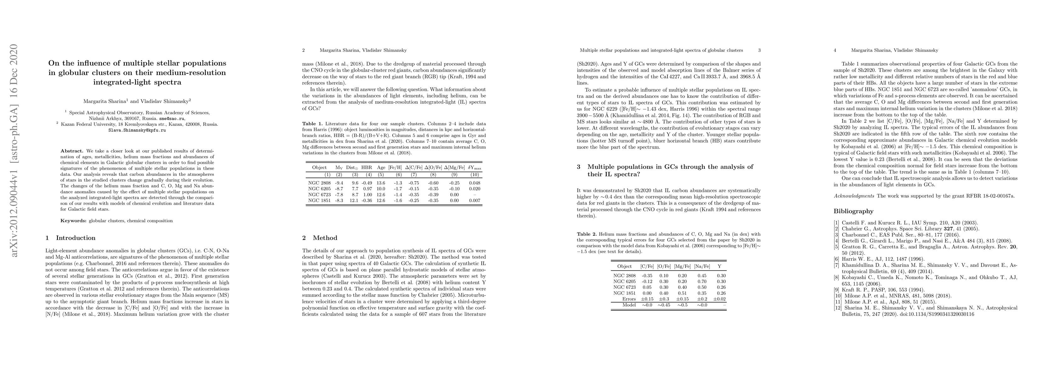 We take a closer look at our published results of determination of ages, metallicities, helium mass fractions and abundances of chemical elements in Galactic globular clusters in order to find possible signatures of the phenomenon of multiple stellar populations in these data. Our analysis reveals that carbon abundances in the atmospheres of stars in the studied clusters change gradually during their evolution. The changes of the helium mass fraction and C, O, Mg and Na abundance anomalies caused by the effect of multiple stellar populations on the analyzed integrated-light spectra are detected through the comparison of our results with models of chemical evolution and literature data for Galactic field stars.
