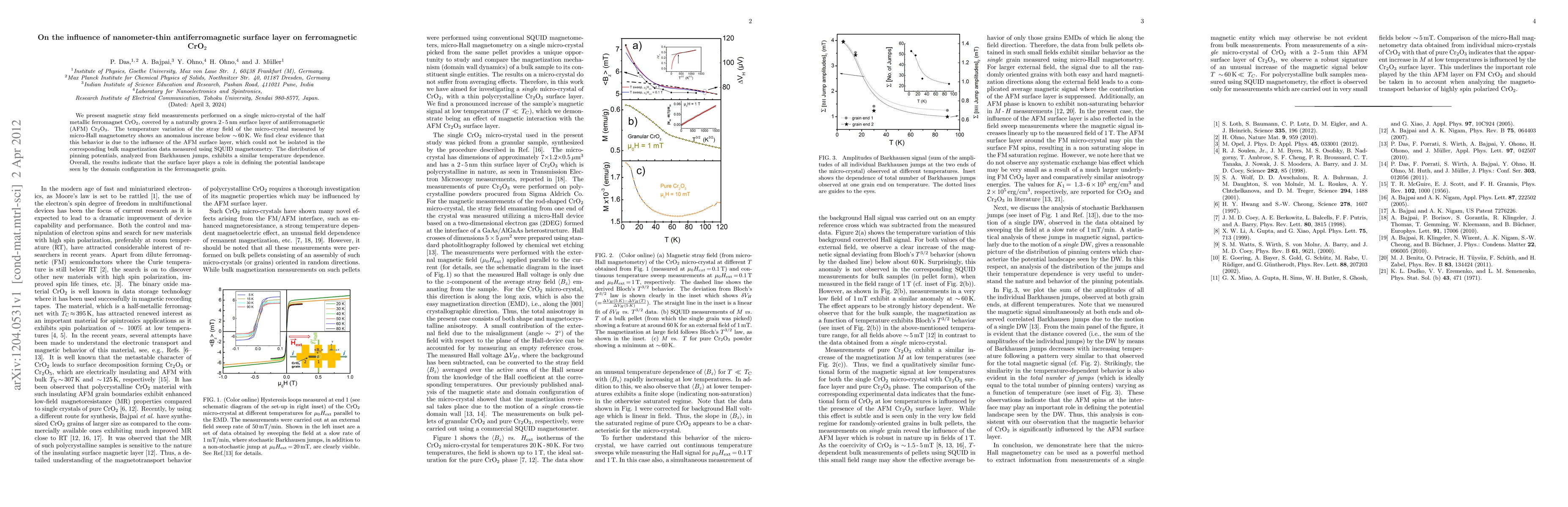 We present magnetic stray field measurements performed on a single micro-crystal of the half metallic ferromagnet CrO$_2$, covered by a naturally grown 2\,-\,5\,nm surface layer of antiferromagnetic (AFM) Cr$_2$O$_3$. The temperature variation of the stray field of the micro-crystal measured by micro-Hall magnetometry shows an anomalous increase below $\sim$\,60\,K. We find clear evidence that this behavior is due to the influence of the AFM surface layer, which could not be isolated in the corresponding bulk magnetization data measured using SQUID magnetometry. The distribution of pinning potentials, analyzed from Barkhausen jumps, exhibits a similar temperature dependence. Overall, the results indicate that the surface layer plays a role in defining the potential landscape seen by the domain configuration in the ferromagnetic grain.