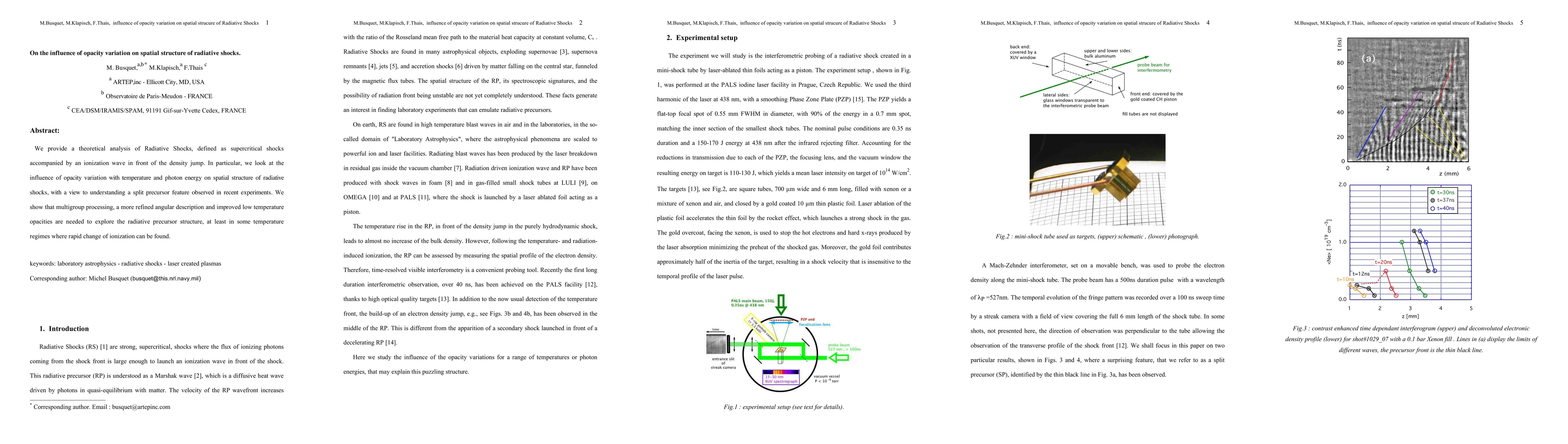We provide a theoretical analysis of Radiative Shocks, defined as supercritical shocks accompanied by an ionization wave in front of the density jump. In particular, we look at the influence of opacity variation with temperature and photon energy on spatial structure of radiative shocks, with a view to understanding a split precursor feature observed in recent experiments. We show that multigroup processing, a more refined angular description and improved low temperature opacities are needed to explore the radiative precursor structure, at least in some temperature regimes where rapid change of ionization can be found.