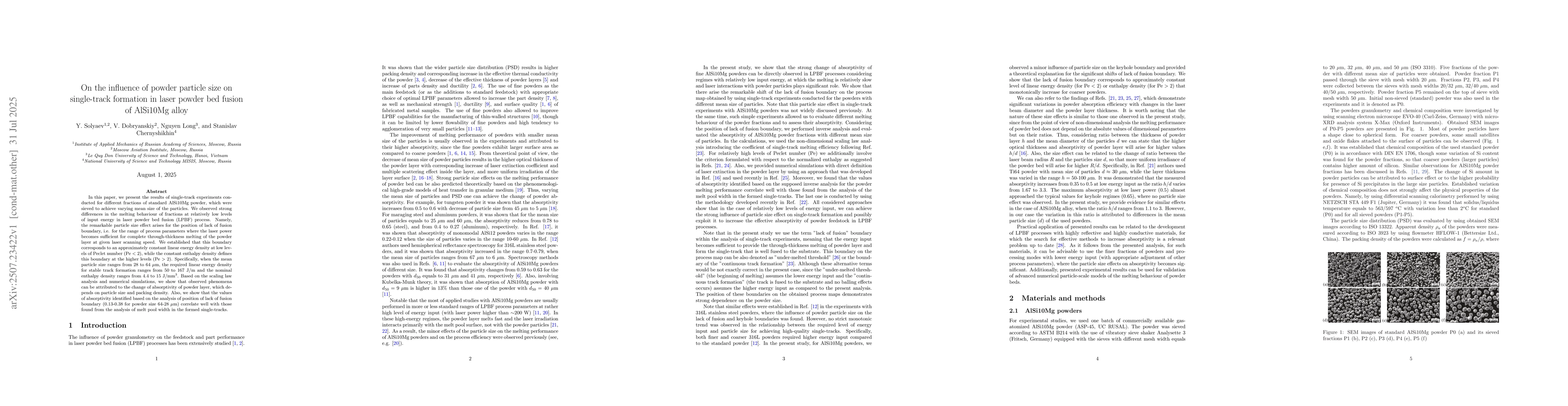 The research examines the impact of AlSi10Mg powder particle size on single-track formation in laser powder bed fusion. Key findings include distinct melting behaviors at low laser energy levels, with lack of fusion boundary defined by linear energy density (Pe < 2) or enthalpy density (Pe > 2). The study reveals that particle sizes from 28 to 64 microns require 50-167 J/m linear energy density and 4.4-15 J/mm³ enthalpy density for stable track formation. Results suggest that changes in absorptivity due to particle size and packing density drive these phenomena, supported by scaling law analysis and numerical simulations.