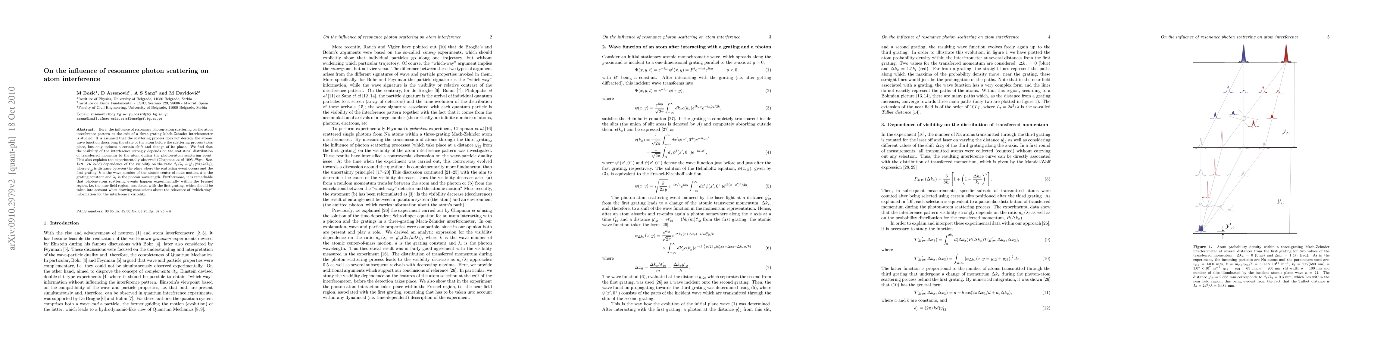 This study investigates how resonance photon-atom scattering affects atom interference patterns in a Mach-Zehnder interferometer. The research finds that interference visibility depends on the statistical distribution of momentum transferred to atoms during scattering, aligning with experimental observations and emphasizing the role of "which-way" information in near-field scattering events.