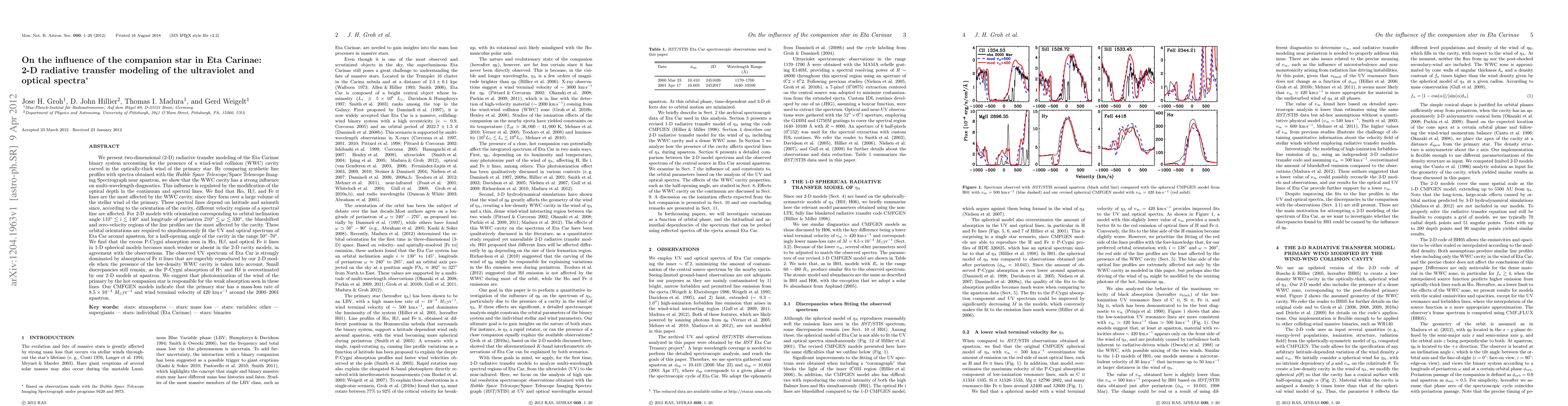 A 2D radiative transfer model of Eta Carinae shows that a companion star's wind affects the binary system's ultraviolet and optical spectra, with H-alpha, H-beta, and Fe II lines being most impacted. The model successfully reproduces the observed spectrum, except for minor discrepancies in certain absorption lines.