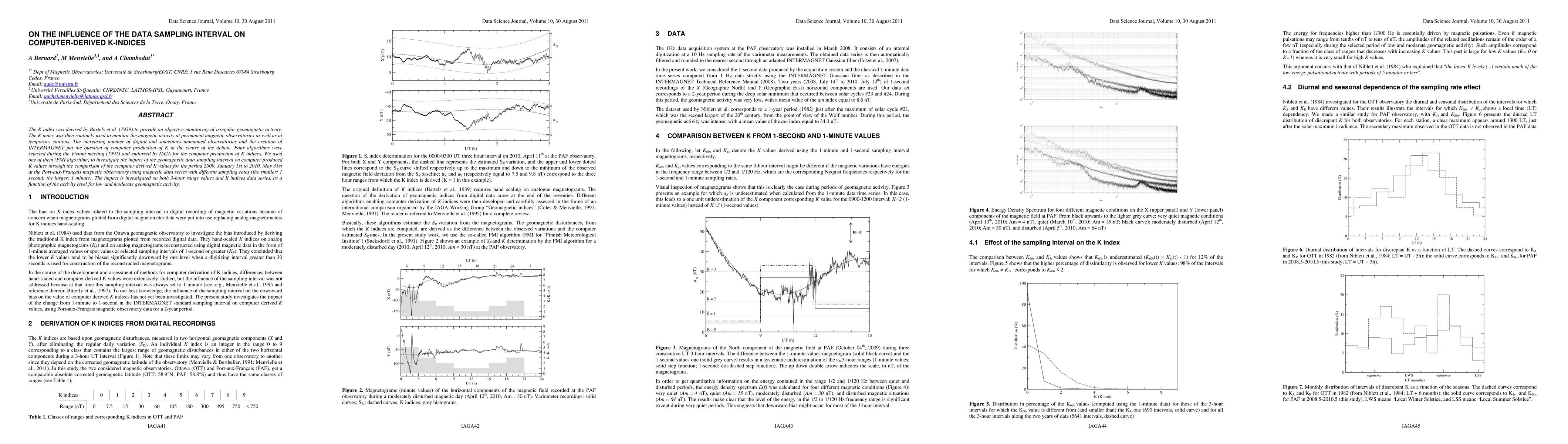 This paper examines the influence of varying data sampling intervals on computer-derived K indices, using the FMI algorithm and data from the Port-aux-Francais observatory. It finds significant differences in K index values depending on the sampling rate, with implications for geomagnetic activity monitoring.