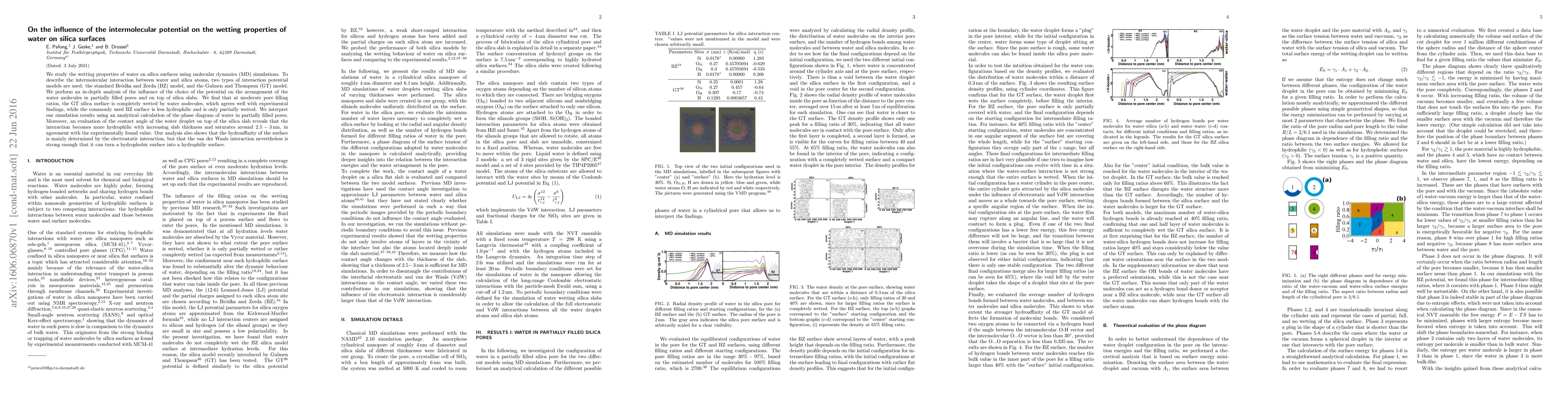This study uses molecular dynamics simulations to analyze the wetting properties of water on silica surfaces, comparing two interaction potential models: BZ and GT. The GT model shows complete wetting at moderate pore filling, aligning with experimental data, while the BZ model results in partial wetting. The research highlights the importance of electrostatic and van der Waals interactions in determining surface hydrophilicity.