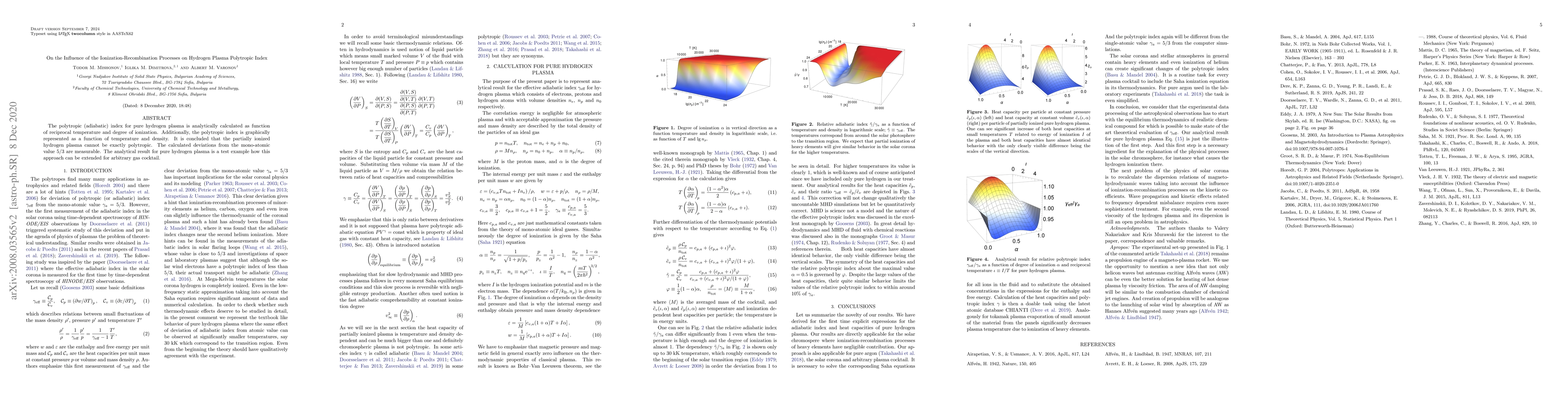 This paper analytically calculates the polytropic index for pure hydrogen plasma, showing measurable deviations from the mono-atomic value of 5/3 due to ionization-recombination processes. The findings suggest that partially ionized hydrogen plasma cannot be exactly polytropic, with implications for extending this approach to more complex gas mixtures.