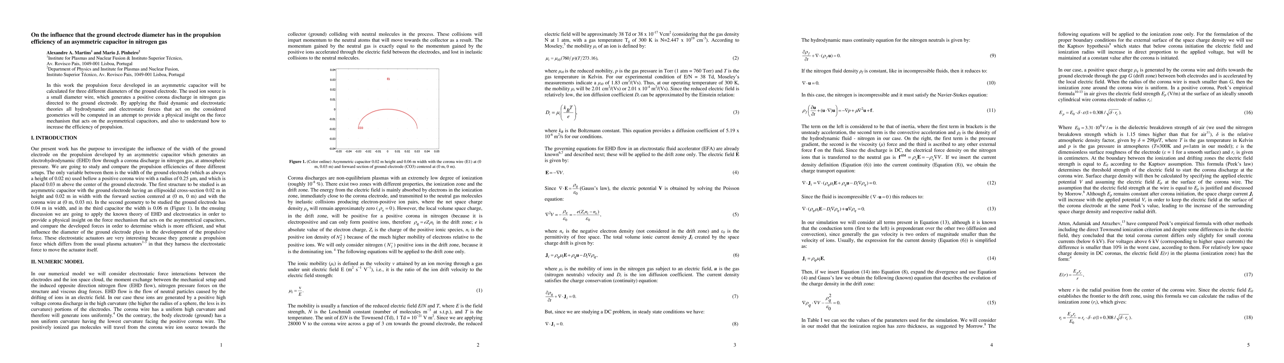 In this work the propulsion force developed in an asymmetric capacitor will be calculated for three different diameters of the ground electrode. The used ion source is a small diameter wire, which generates a positive corona discharge in nitrogen gas directed to the ground electrode. By applying the fluid dynamic and electrostatic theories all hydrodynamic and electrostatic forces that act on the considered geometries will be computed in an attempt to provide a physical insight on the force mechanism that acts on the asymmetrical capacitors, and also to understand how to increase the efficiency of propulsion.