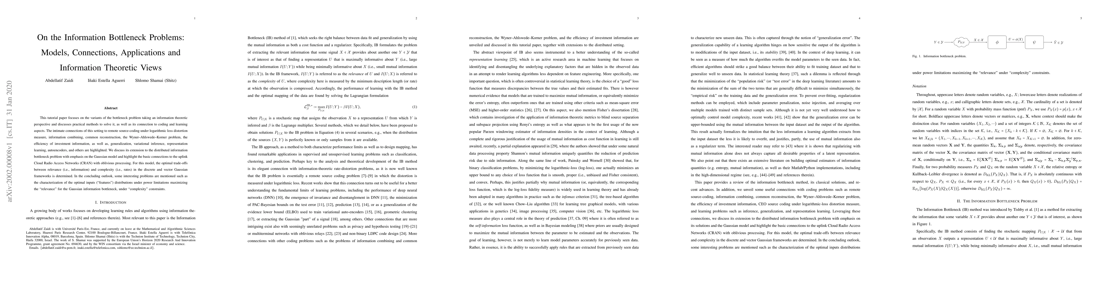 This tutorial paper focuses on the variants of the bottleneck problem taking an information theoretic perspective and discusses practical methods to solve it, as well as its connection to coding and learning aspects. The intimate connections of this setting to remote source-coding under logarithmic loss distortion measure, information combining, common reconstruction, the Wyner-Ahlswede-Korner problem, the efficiency of investment information, as well as, generalization, variational inference, representation learning, autoencoders, and others are highlighted. We discuss its extension to the distributed information bottleneck problem with emphasis on the Gaussian model and highlight the basic connections to the uplink Cloud Radio Access Networks (CRAN) with oblivious processing. For this model, the optimal trade-offs between relevance (i.e., information) and complexity (i.e., rates) in the discrete and vector Gaussian frameworks is determined. In the concluding outlook, some interesting problems are mentioned such as the characterization of the optimal inputs ("features") distributions under power limitations maximizing the "relevance" for the Gaussian information bottleneck, under "complexity" constraints.