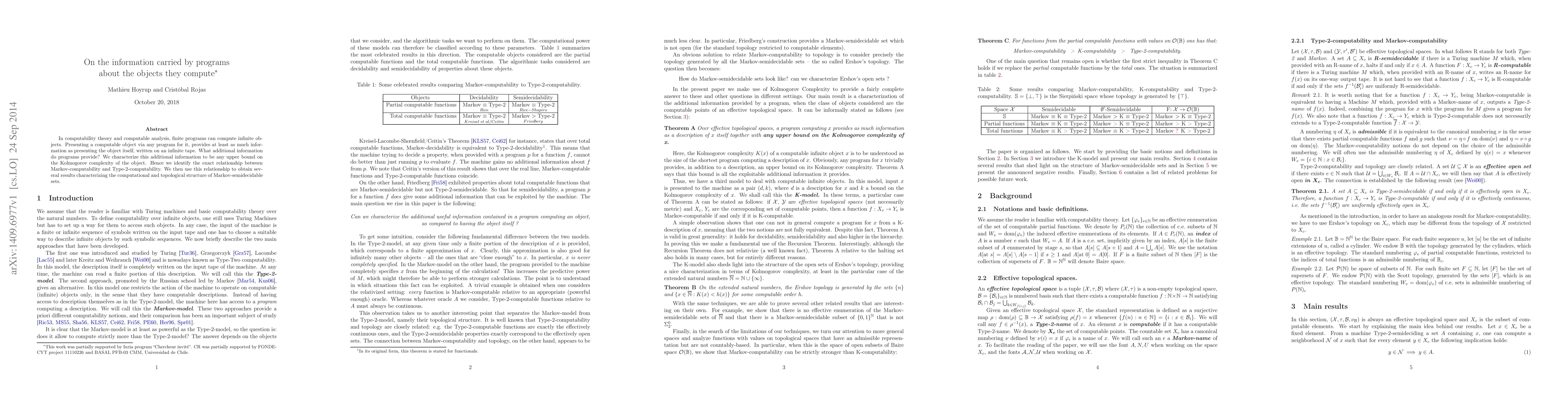 In computability theory and computable analysis, finite programs can compute infinite objects. Presenting a computable object via any program for it, provides at least as much information as presenting the object itself, written on an infinite tape. What additional information do programs provide? We characterize this additional information to be any upper bound on the Kolmogorov complexity of the object. Hence we identify the exact relationship between Markov-computability and Type-2-computability. We then use this relationship to obtain several results characterizing the computational and topological structure of Markov-semidecidable sets.