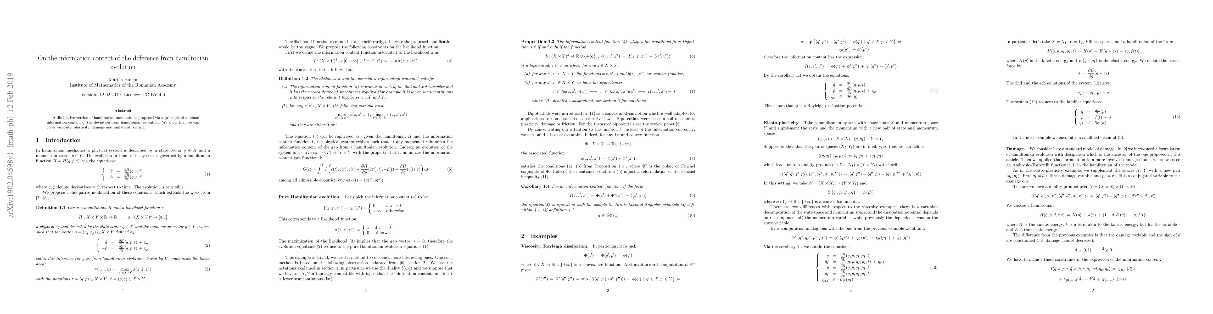This paper proposes a dissipative extension of Hamiltonian mechanics based on minimal information content deviation, covering phenomena like viscosity, plasticity, damage, and unilateral contact. The approach aims to unify various non-Hamiltonian processes under a single framework.