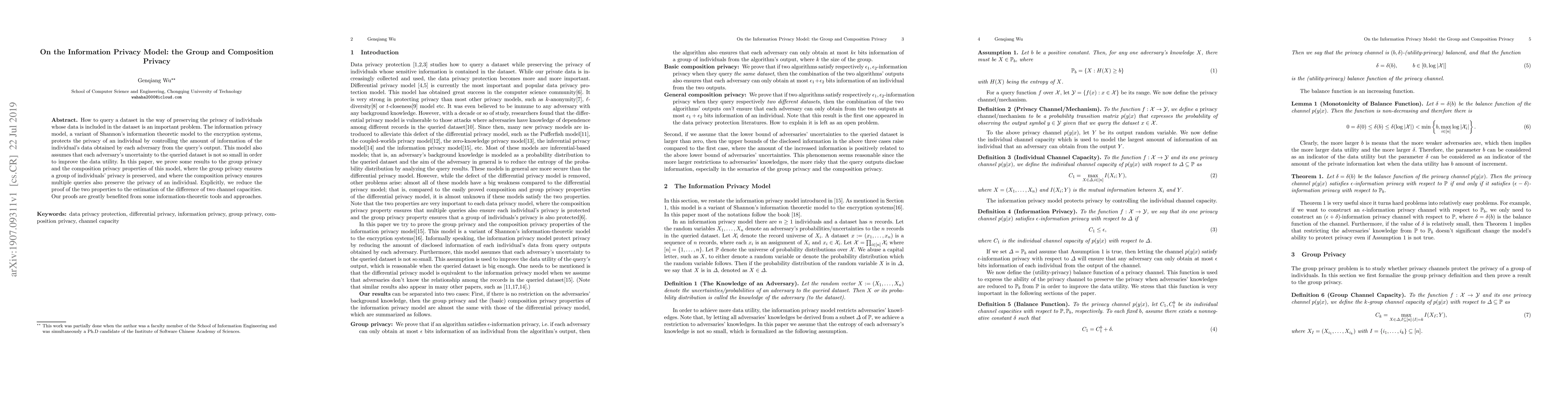 This paper proves two key properties of the information privacy model: group privacy ensures a group of individuals' data remains private, while composition privacy preserves individual privacy across multiple queries.