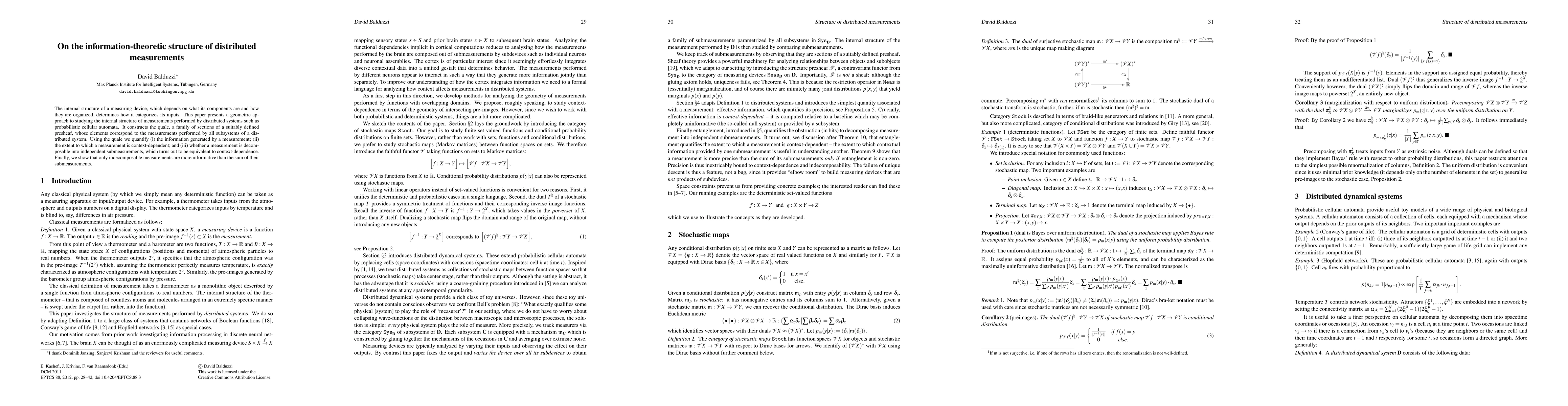 The internal structure of a measuring device, which depends on what its components are and how they are organized, determines how it categorizes its inputs. This paper presents a geometric approach to studying the internal structure of measurements performed by distributed systems such as probabilistic cellular automata. It constructs the quale, a family of sections of a suitably defined presheaf, whose elements correspond to the measurements performed by all subsystems of a distributed system. Using the quale we quantify (i) the information generated by a measurement; (ii) the extent to which a measurement is context-dependent; and (iii) whether a measurement is decomposable into independent submeasurements, which turns out to be equivalent to context-dependence. Finally, we show that only indecomposable measurements are more informative than the sum of their submeasurements.