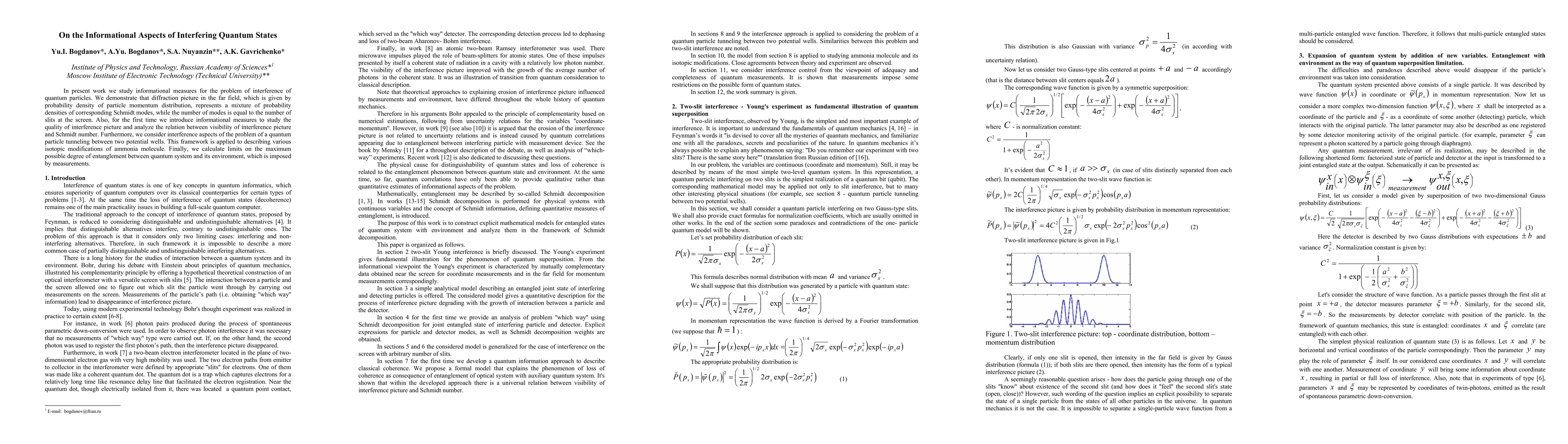 In present work we study informational measures for the problem of interference of quantum particles. We demonstrate that diffraction picture in the far field, which is given by probability density of particle momentum distribution, represents a mixture of probability densities of corresponding Schmidt modes, while the number of modes is equal to the number of slits at the screen. Also, for the first time we introduce informational measures to study the quality of interference picture and analyze the relation between visibility of interference picture and Schmidt number. Furthermore, we consider interference aspects of the problem of a quantum particle tunneling between two potential wells. This framework is applied to describing various isotopic modifications of ammonia molecule. Finally, we calculate limits on the maximum possible degree of entanglement between quantum system and its environment, which is imposed by measurements