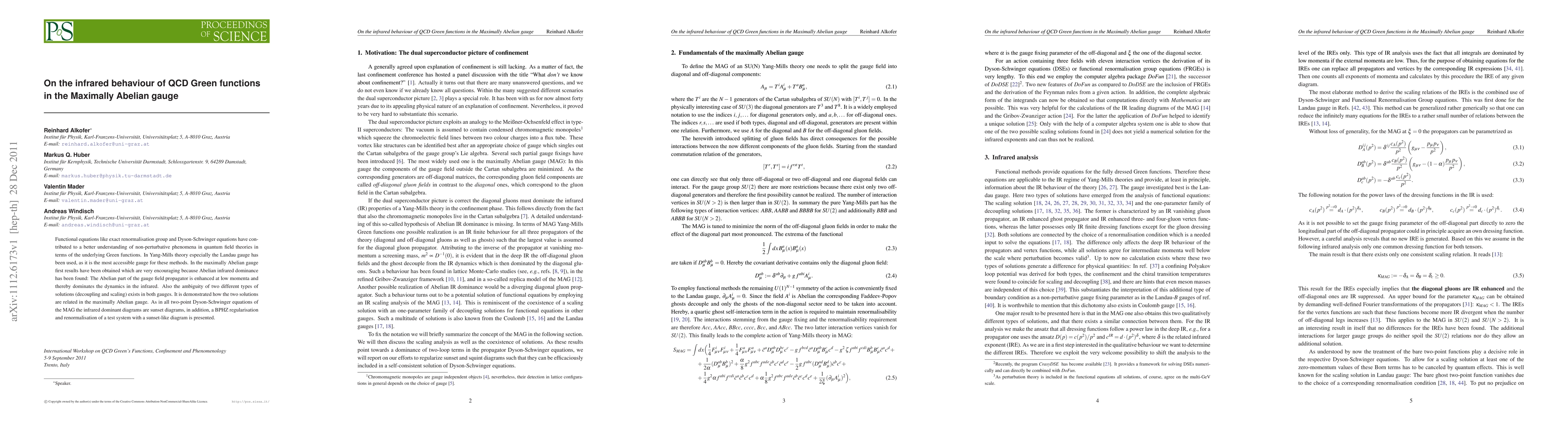 The research explores QCD Green functions' infrared behavior in Maximally Abelian gauge, finding Abelian part of gauge field propagator dominates at low momenta. It also demonstrates the relationship between two solution types (decoupling and scaling) in this gauge, using sunset diagrams and BPHZ regularization.