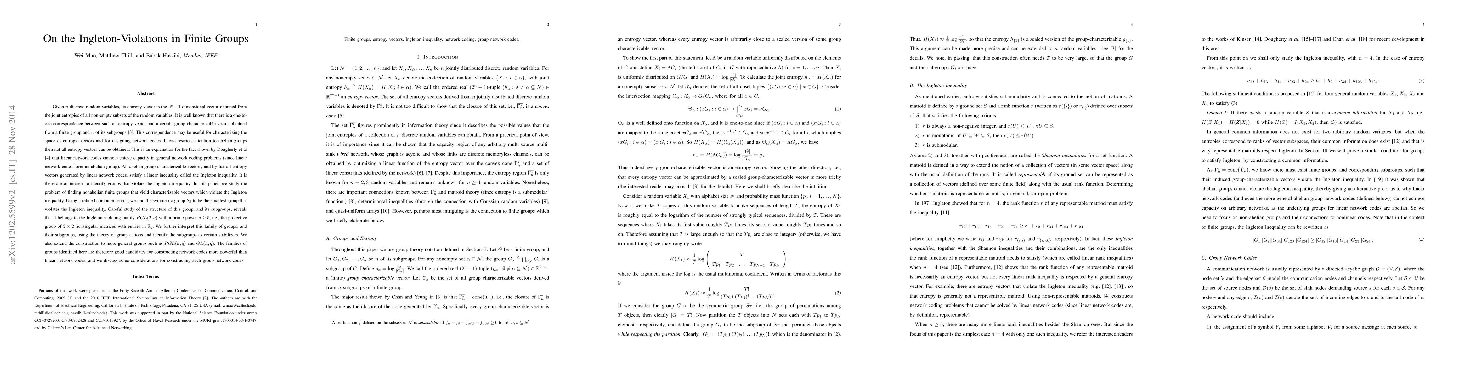 Given $n$ discrete random variables, its entropy vector is the $2^n-1$ dimensional vector obtained from the joint entropies of all non-empty subsets of the random variables. It is well known that there is a one-to-one correspondence between such an entropy vector and a certain group-characterizable vector obtained from a finite group and $n$ of its subgroups [3]. This correspondence may be useful for characterizing the space of entropic vectors and for designing network codes. If one restricts attention to abelian groups then not all entropy vectors can be obtained. This is an explanation for the fact shown by Dougherty et al [4] that linear network codes cannot achieve capacity in general network coding problems. All abelian group-characterizable vectors, and by fiat all entropy vectors generated by linear network codes, satisfy a linear inequality called the Ingleton inequality. It is therefore of interest to identify groups that violate the Ingleton inequality. In this paper, we study the problem of finding nonabelian finite groups that yield characterizable vectors which violate the Ingleton inequality. Using a refined computer search, we find the symmetric group $S_5$ to be the smallest group that violates the Ingleton inequality. Careful study of the structure of this group, and its subgroups, reveals that it belongs to the Ingleton-violating family $PGL(2,q)$ with a prime power $q \geq 5$, i.e., the projective group of $2\times 2$ nonsingular matrices with entries in $\mathbb{F}_q$. We further interpret this family using the theory of group actions. We also extend the construction to more general groups such as $PGL(n,q)$ and $GL(n,q)$. The families of groups identified here are therefore good candidates for constructing network codes more powerful than linear network codes, and we discuss some considerations for constructing such group network codes.