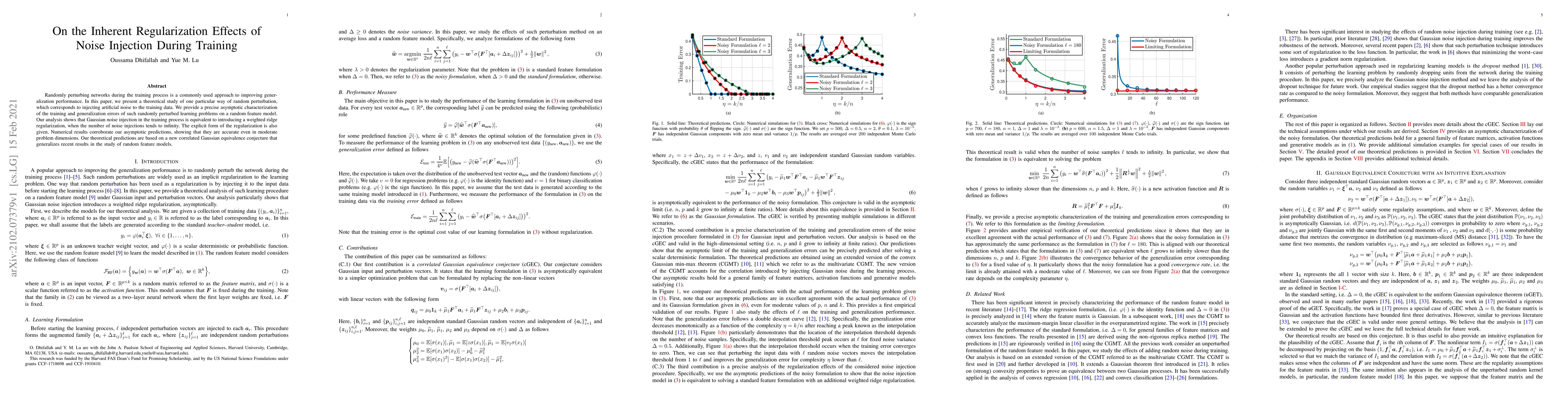 This paper theoretically analyzes the regularization effects of injecting Gaussian noise during training, showing it is equivalent to ridge regularization in the limit of infinite noise injections. The study uses a random feature model and provides numerical results that validate the theoretical predictions.