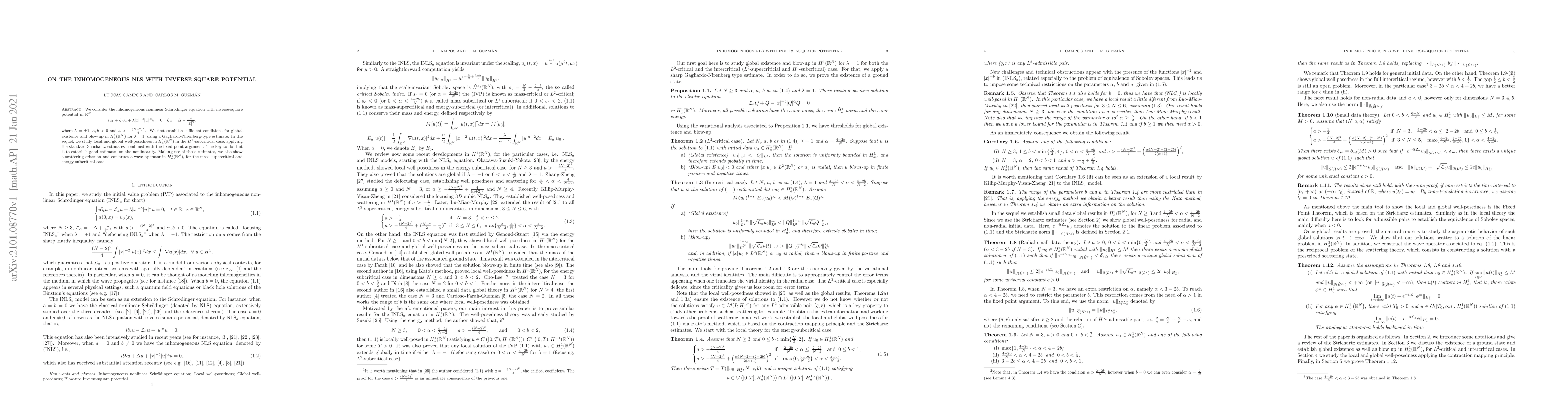This research paper examines the inhomogeneous nonlinear Schrödinger equation with inverse-square potential in $mathbb{R}^N$. It establishes conditions for global existence and blow-up, and analyzes local and global well-posedness using Strichartz estimates and a fixed point argument. The study also reveals a scattering criterion and constructs a wave operator for the mass-supercritical and energy-subcritical case in $H^1_a(mathbb{R}^N)$.