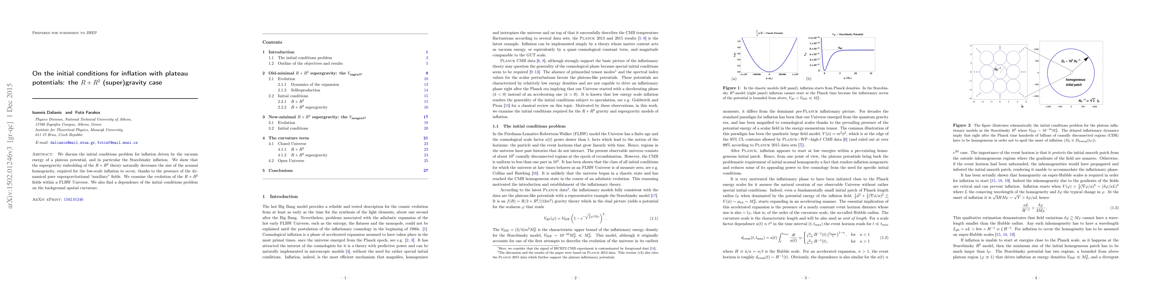 We discuss the initial conditions problem for inflation driven by the vacuum energy of a plateau potential, and in particular the Starobinsky inflation. We show that the supergravity embedding of the $R+R^2$ theory naturally decreases the size of the acausal homogeneity, required for the low-scale inflation to occur, thanks to the presence of the dynamical pure supergravitational "auxiliary" fields. We examine the evolution of the $R+R^2$ fields within a FLRW Universe. We also find a dependence of the initial conditions problem on the background spatial curvature.