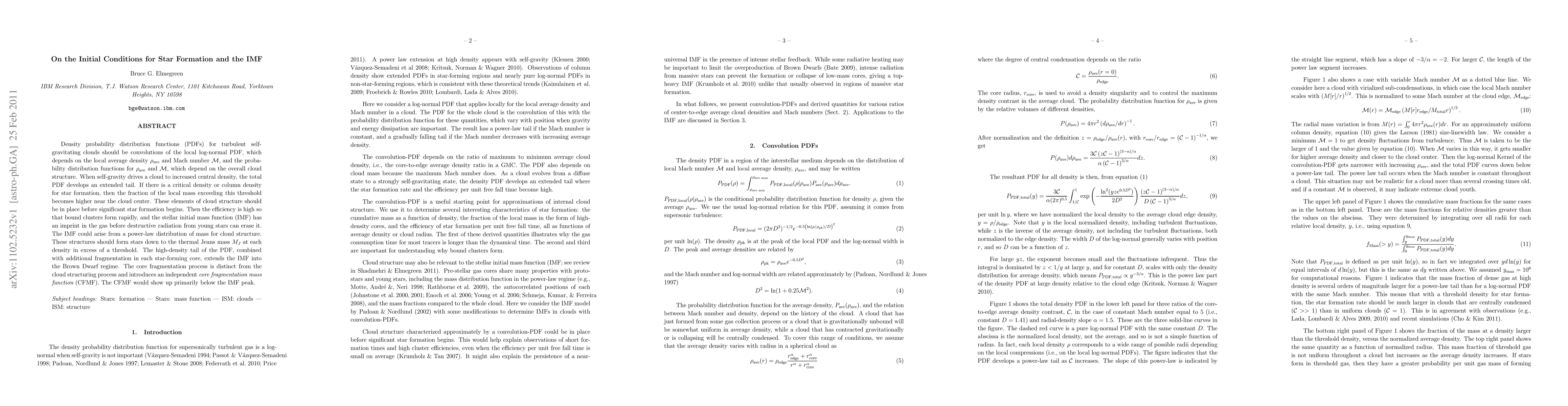 This paper explores the initial conditions in turbulent, self-gravitating clouds that lead to star formation and shape the stellar initial mass function (IMF). It suggests that the cloud's density and structure, particularly the high-density tail, influence the formation of stars and brown dwarfs, with the IMF reflecting the cloud's mass distribution.