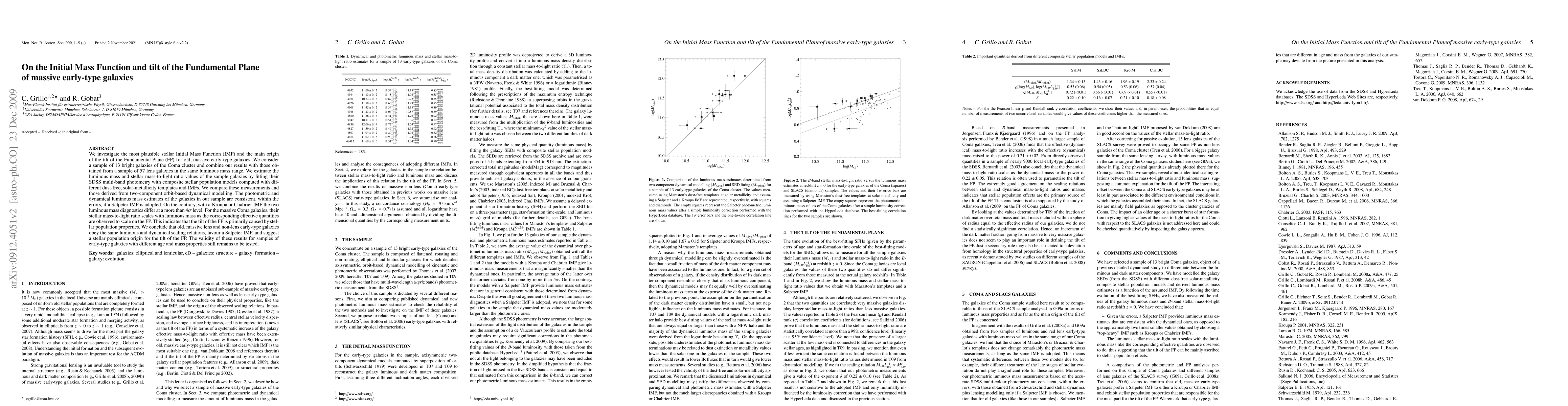 This paper investigates the stellar Initial Mass Function (IMF) and the origin of the tilt of the Fundamental Plane (FP) in old, massive early-type galaxies. It finds that a Salpeter IMF provides consistent luminous mass estimates, while Kroupa or Chabrier IMFs do not, suggesting a stellar population origin for the FP tilt.