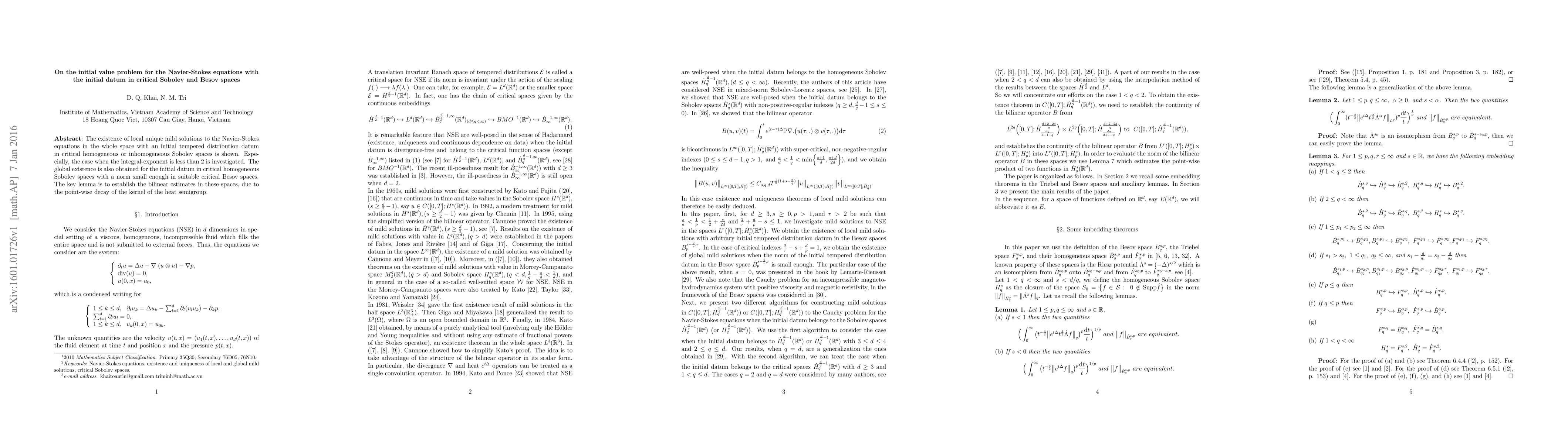 Summary: This paper proves the existence of local unique mild solutions to the Navier-Stokes equations for initial data in critical Sobolev and Besov spaces, particularly focusing on cases when the integral exponent is less than 2. It also establishes global existence for small initial data in critical homogeneous Sobolev spaces, leveraging bilinear estimates and the point-wise decay of the heat semigroup kernel.