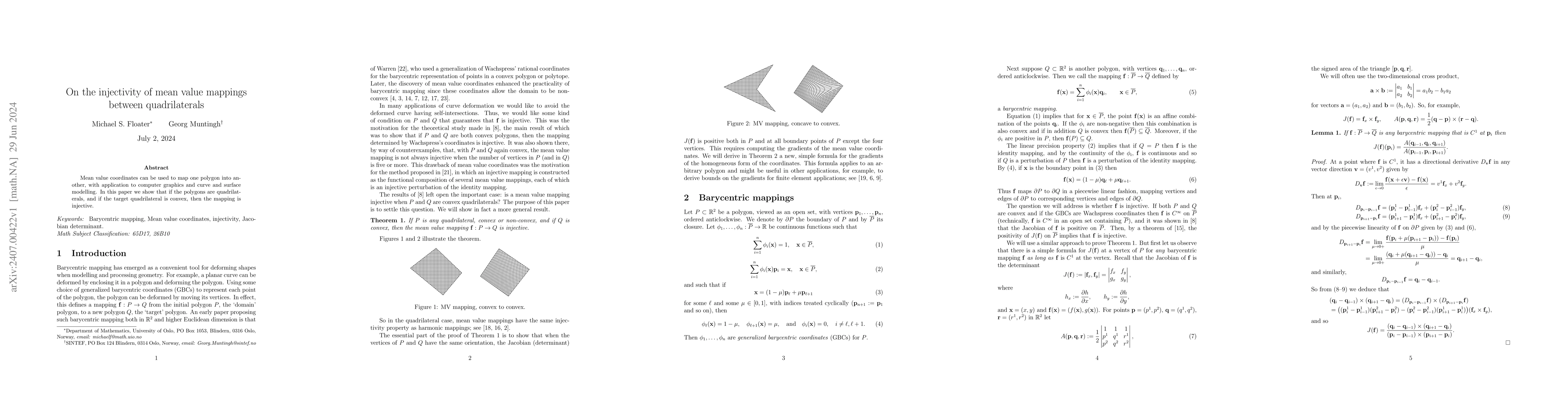 This paper demonstrates that mean value coordinate mappings between quadrilaterals are injective when the target quadrilateral is convex, with implications for applications in computer graphics and surface modeling.