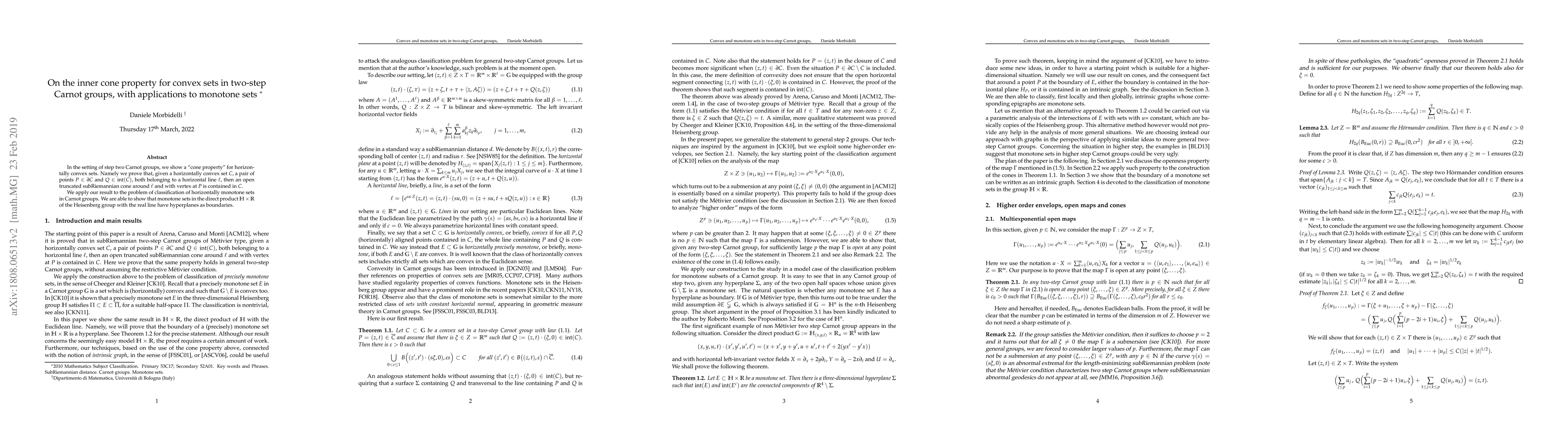 This paper demonstrates a "cone property" for horizontally convex sets in two-step Carnot groups, showing that a truncated subRiemannian cone around a horizontal line connecting a boundary point and an interior point of such a set is contained within the set. The result is applied to classify horizontally monotone sets in these groups, revealing that such sets in the Heisenberg group's product with the real line have hyperplane boundaries.