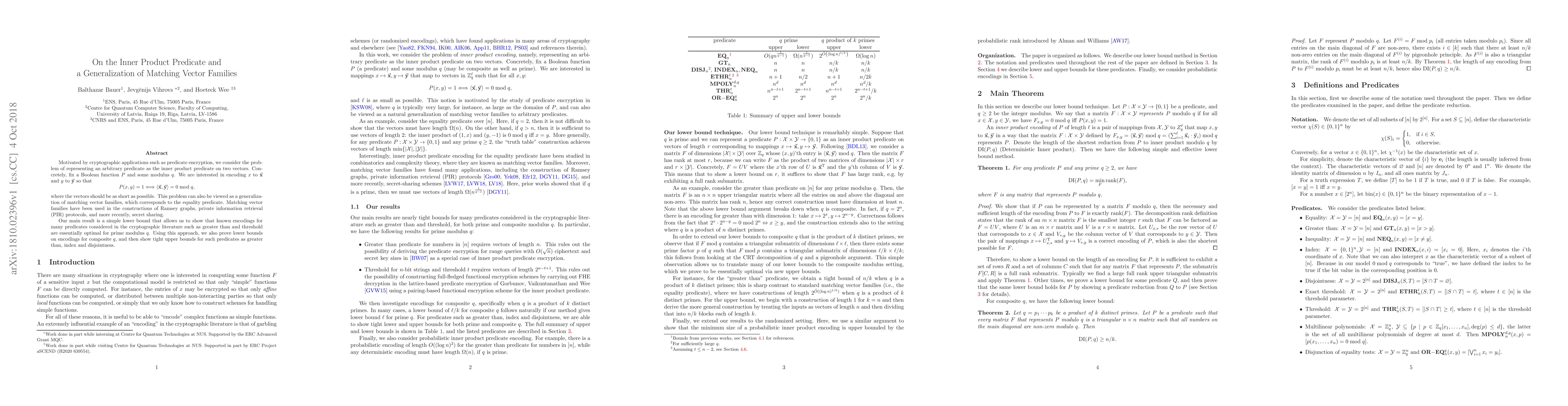 Motivated by cryptographic applications such as predicate encryption, we consider the problem of representing an arbitrary predicate as the inner product predicate on two vectors. Concretely, fix a Boolean function $P$ and some modulus $q$. We are interested in encoding $x$ to $\vec x$ and $y$ to $\vec y$ so that $$P(x,y) = 1 \Longleftrightarrow \langle\vec x,\vec y\rangle= 0 \bmod q,$$ where the vectors should be as short as possible. This problem can also be viewed as a generalization of matching vector families, which corresponds to the equality predicate. Matching vector families have been used in the constructions of Ramsey graphs, private information retrieval (PIR) protocols, and more recently, secret sharing. Our main result is a simple lower bound that allows us to show that known encodings for many predicates considered in the cryptographic literature such as greater than and threshold are essentially optimal for prime modulus $q$. Using this approach, we also prove lower bounds on encodings for composite $q$, and then show tight upper bounds for such predicates as greater than, index and disjointness.