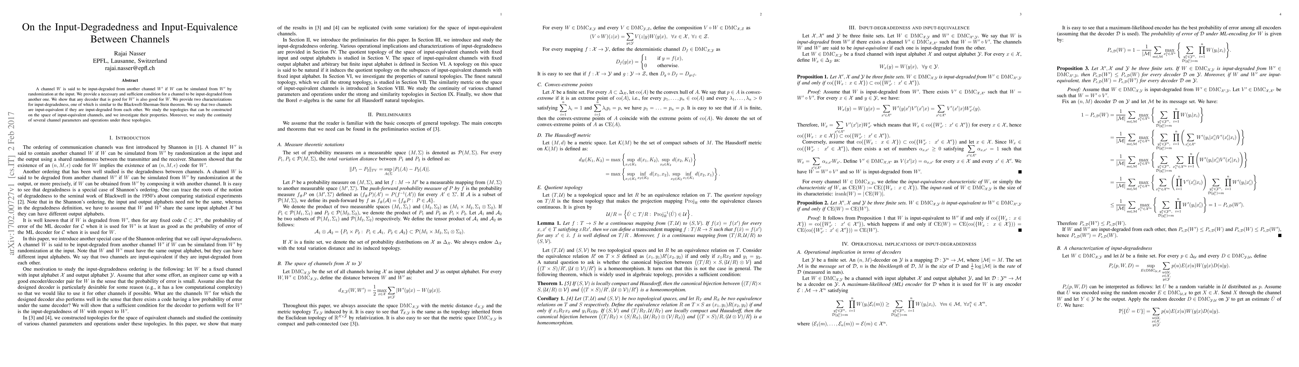 This paper establishes a condition for input-degraded channels to be equivalent, showing that a good decoder for one channel is also good for its degraded version, and explores the implications of these equivalences on channel topologies and parameter continuity.