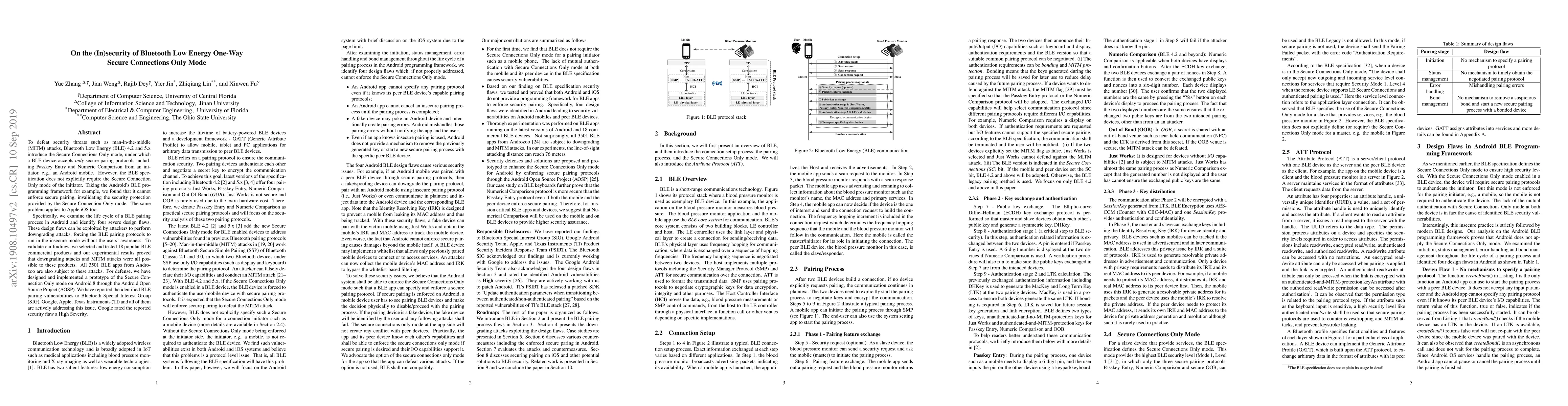 This paper identifies design flaws in the Bluetooth Low Energy (BLE) Secure Connections Only mode, which allows devices to accept only secure pairing protocols. It reveals that Android's BLE framework fails to enforce secure pairing, making it vulnerable to man-in-the-middle attacks and downgrading attacks. Experimental results show that 18 popular BLE devices and 3501 BLE apps are susceptible to these attacks. The authors propose a prototype solution and have reported the vulnerabilities to relevant organizations.